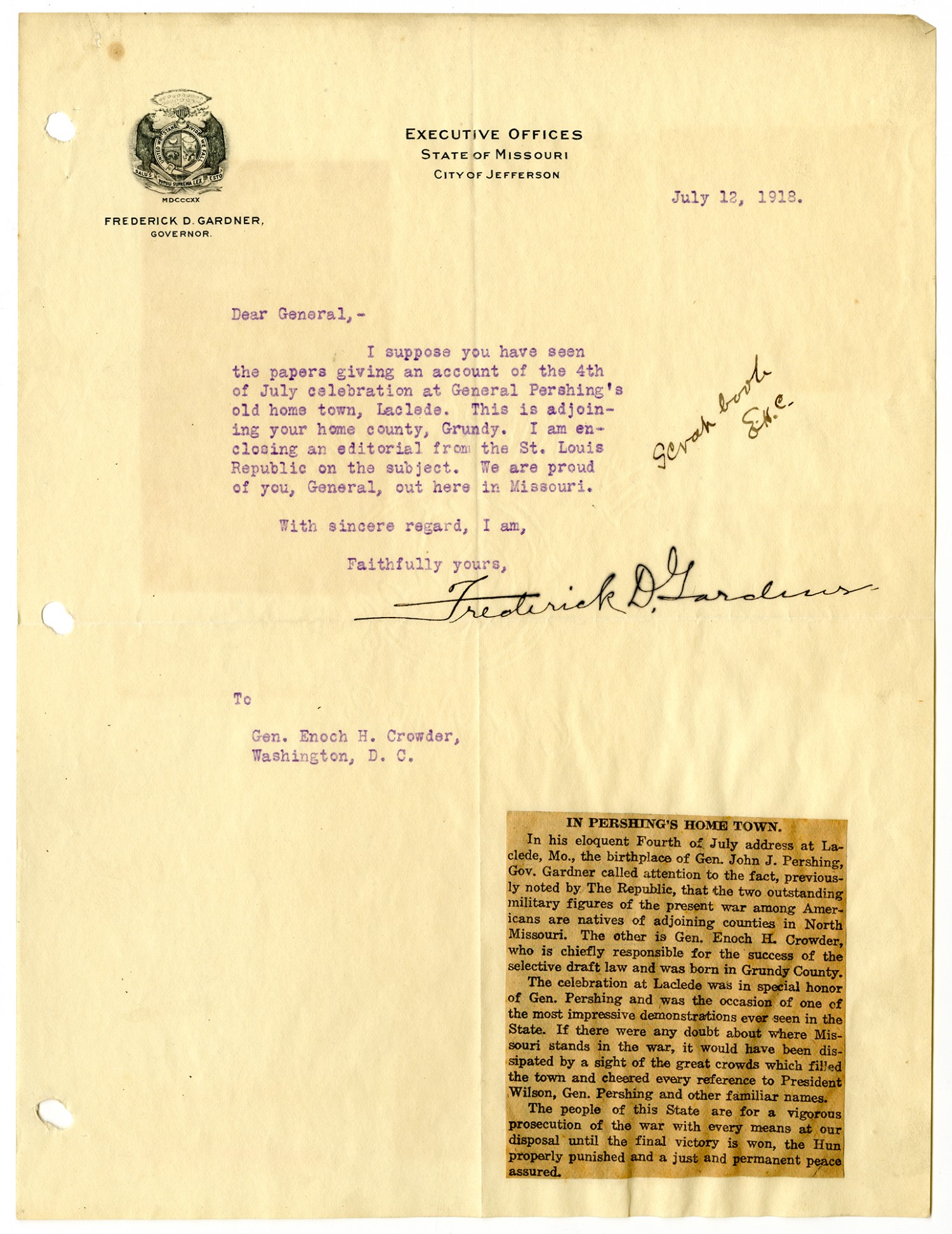 | Description | Letter from the Governor of Missouri, Frederick D. Gardner, to General Enoch H. Crowder. Gardner stated how proud he and the state of Missouri were of him and included a newspaper clipping from the St. Louis Republic that discussed the Fourth of July celebration in General John J. Pershing's home town of Laclede. This document is part of a collection compiled by Enoch Herbert Crowder, the Edinburg, Grundy County, Missouri native who served as Judge Advocate General. Crowder devised the Selective Service Act in 1917 which drafted America's forces during World War I. |