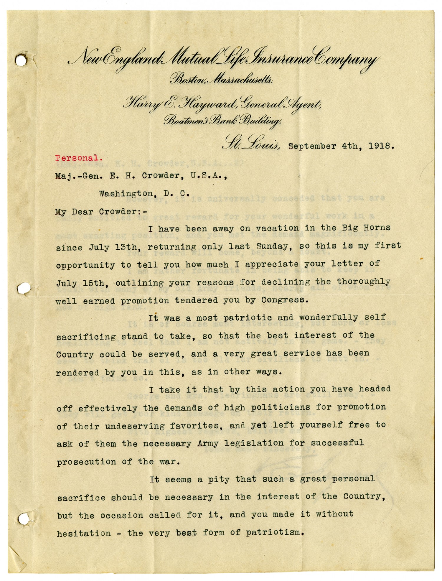 September 4th, 1918. Personal. Maj.-Gen. E. H. Crowder, U.S.A., Washington, D.C. My Dear Crowder:- I have been away on vacation in the Big Horns since July 13th, returning only last Sunday, so this is my first opportunity to tell you how much I appreciate your letter of July 15, outlining your reasons for declining the thoroughly well earned promotion tendered you by Congress. It was a most patriotic and wonderfully self sacrificing stand to take, so that the best interest of the Country could be served, and a very great service has been rendered by you in this, as in other ways. I take it that by this action you have headed off effectively the demands of high politicians for promotion of their undeserving favorites, and yet left yourself free to ask of them the necessary Army legislation for successful prosecution of the war. It seems a pity that such a great personal sacrifice should be necessary in the interest of the Country, but the occasion called for it, and you made it without hesitation-the very best form of patriotism.