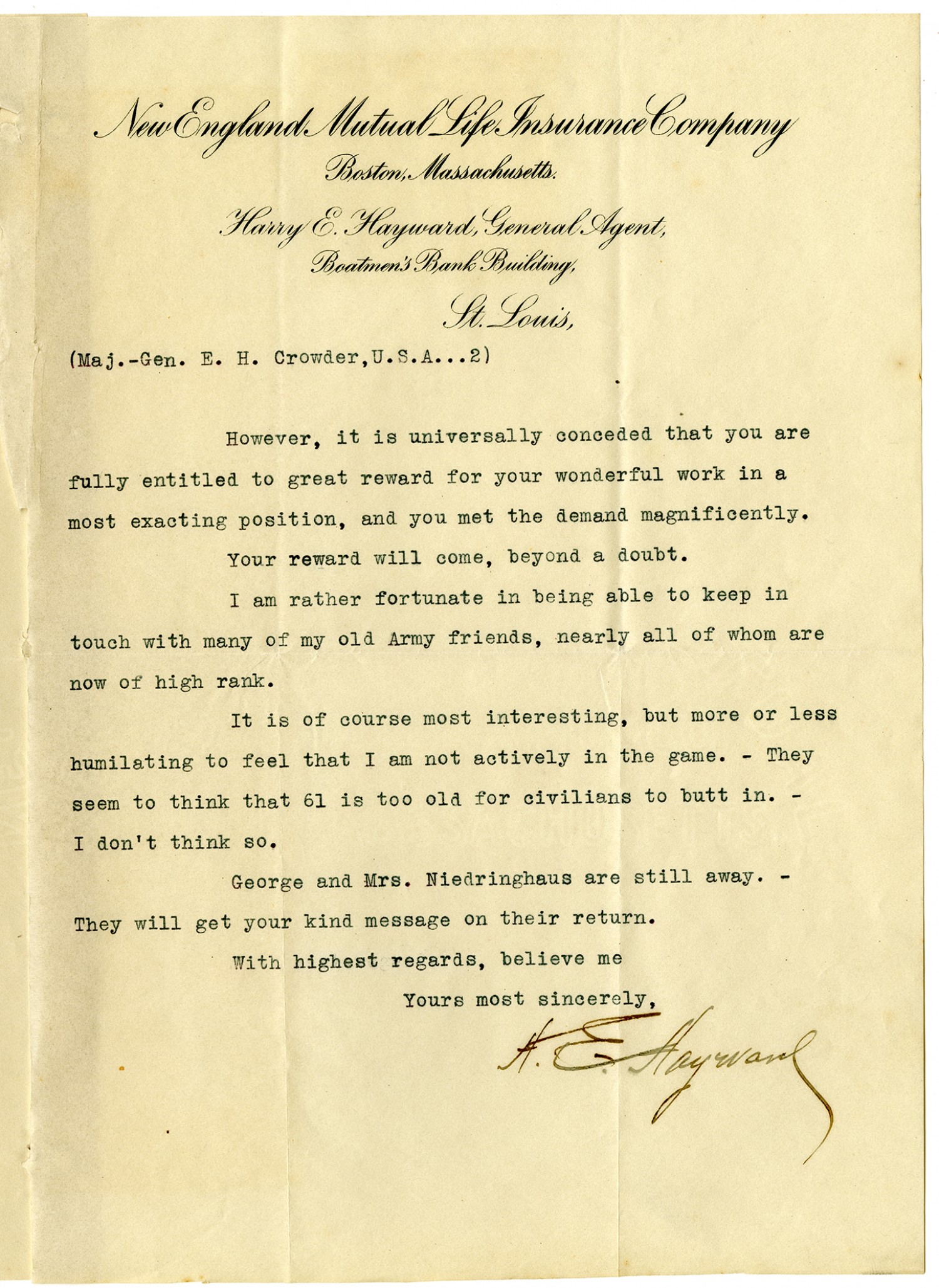 | Description | Letter from Harry E. Hayward of the New England Mutual Life Insurance Company to General Enoch H. Crowder stating that he was impressed with Crowder's sacrifice of declining the promotion to Lieutenant General. This document is part of a collection compiled by Enoch Herbert Crowder, the Edinburg, Grundy County, Missouri native who served as Judge Advocate General. Crowder devised the Selective Service Act in 1917 which drafted America's forces during World War I. |