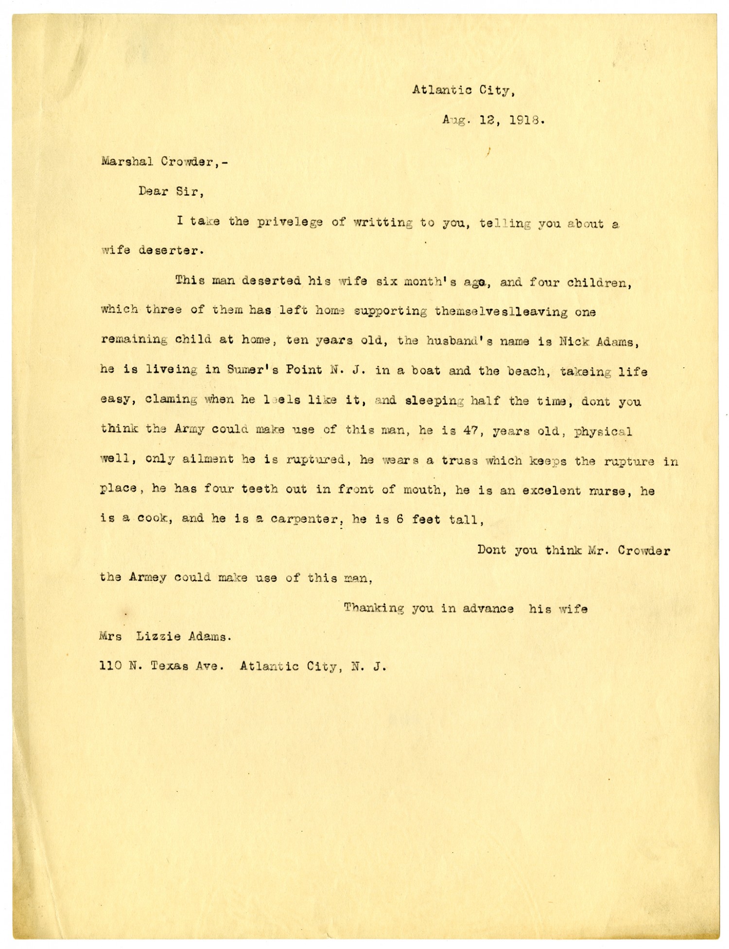 Atlantic City, [August] 12, 1918. Marshal Crowder,- Dear Sir, I take the privelege of writing to you, telling you about a wife deserter. This man deserted his wife six month