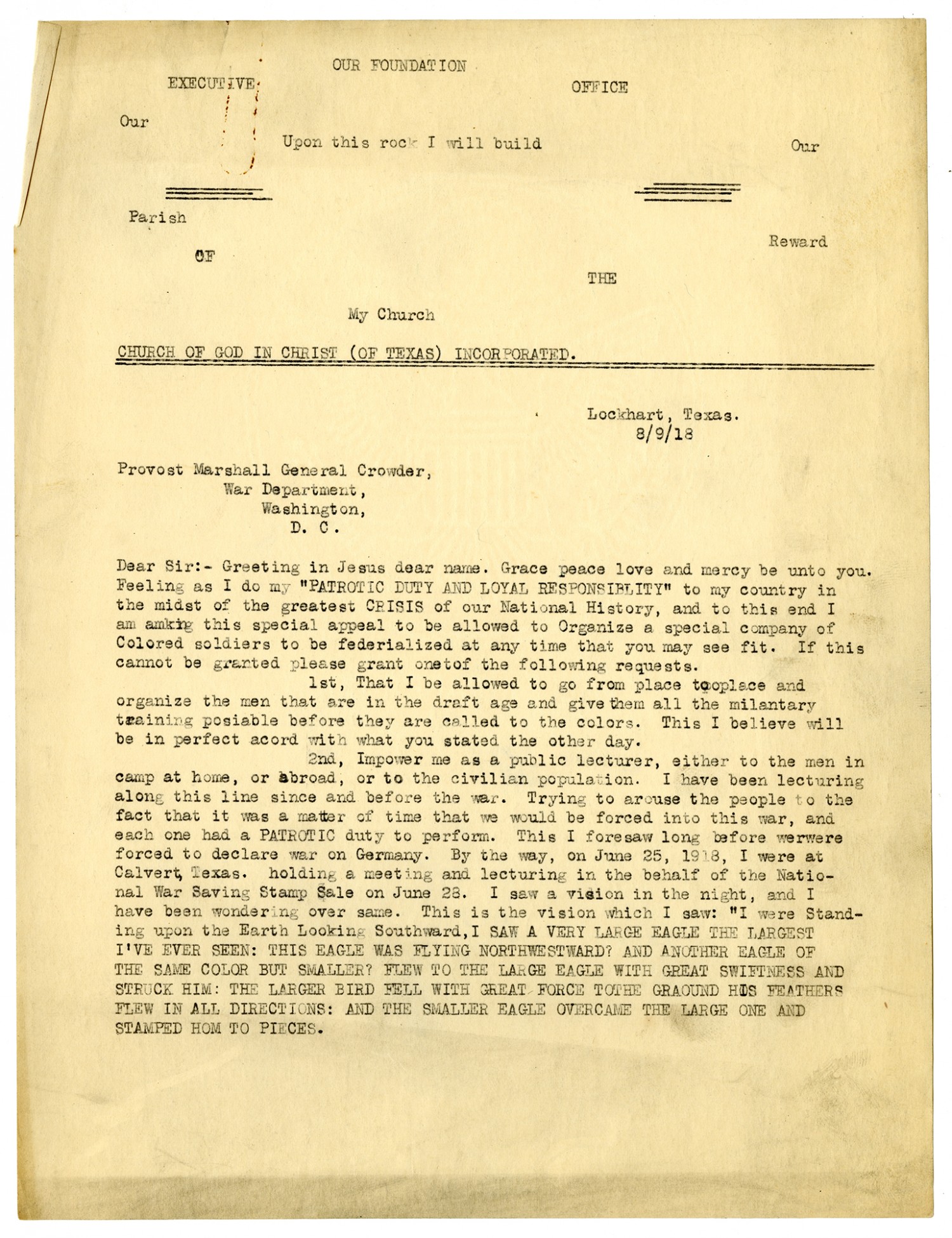 Our Foundation Executive Office Our Upon this rock I will build Our Parish Reward Of The My Church Church of God in Christ (Of Texas) Incorporated. Lockhart, Texas. 8/9/[1918] Provost Marshall General Crowder, War Department, Washington, D.C. Dear Sir:- Greeting in Jesus dear name. Grace peace love and mercy be unto you. Feeling as I do my