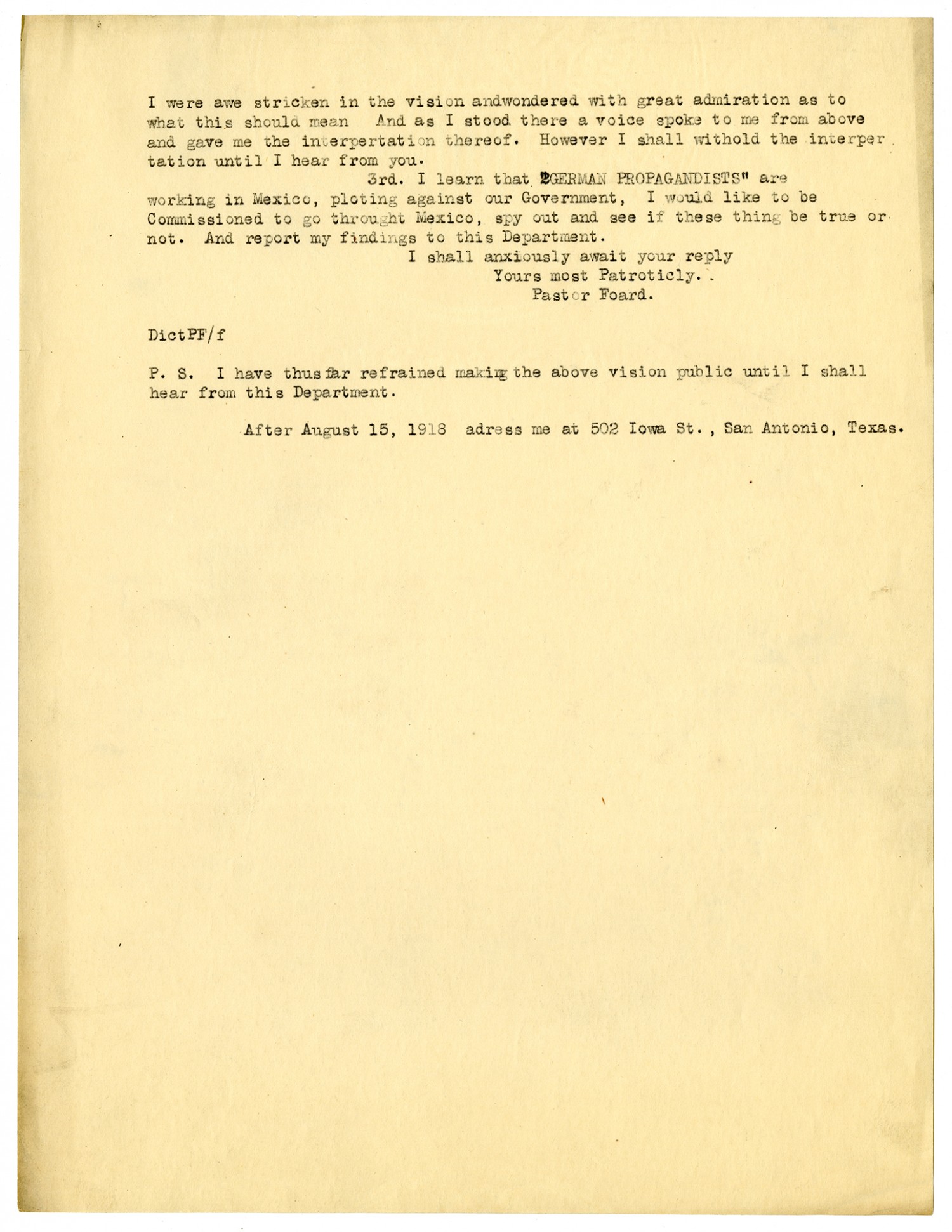 I were awe stricken in the vision andwondered with great admiration as to what this should mean And as I stood there a voice spoke to me from above and gave me the interpertation thereof. However I shall withold the interpertation until I hear from you. 3rd. I learn that German Propagandist are working in Mexico, plotting against our Government, I would like to be Commissioned to go throught Mexico, spy out and see if these thing be true or not. And report my findings to this Department. I shall anxiously await your reply Your most Patroticly. Pastor Foard. DictPF/f P.S. I have thus far refrained making the above vision public until I shall hear from this Department. After August 15, 1918 adress me at 502 Iowa St., San Antonio, Texas.