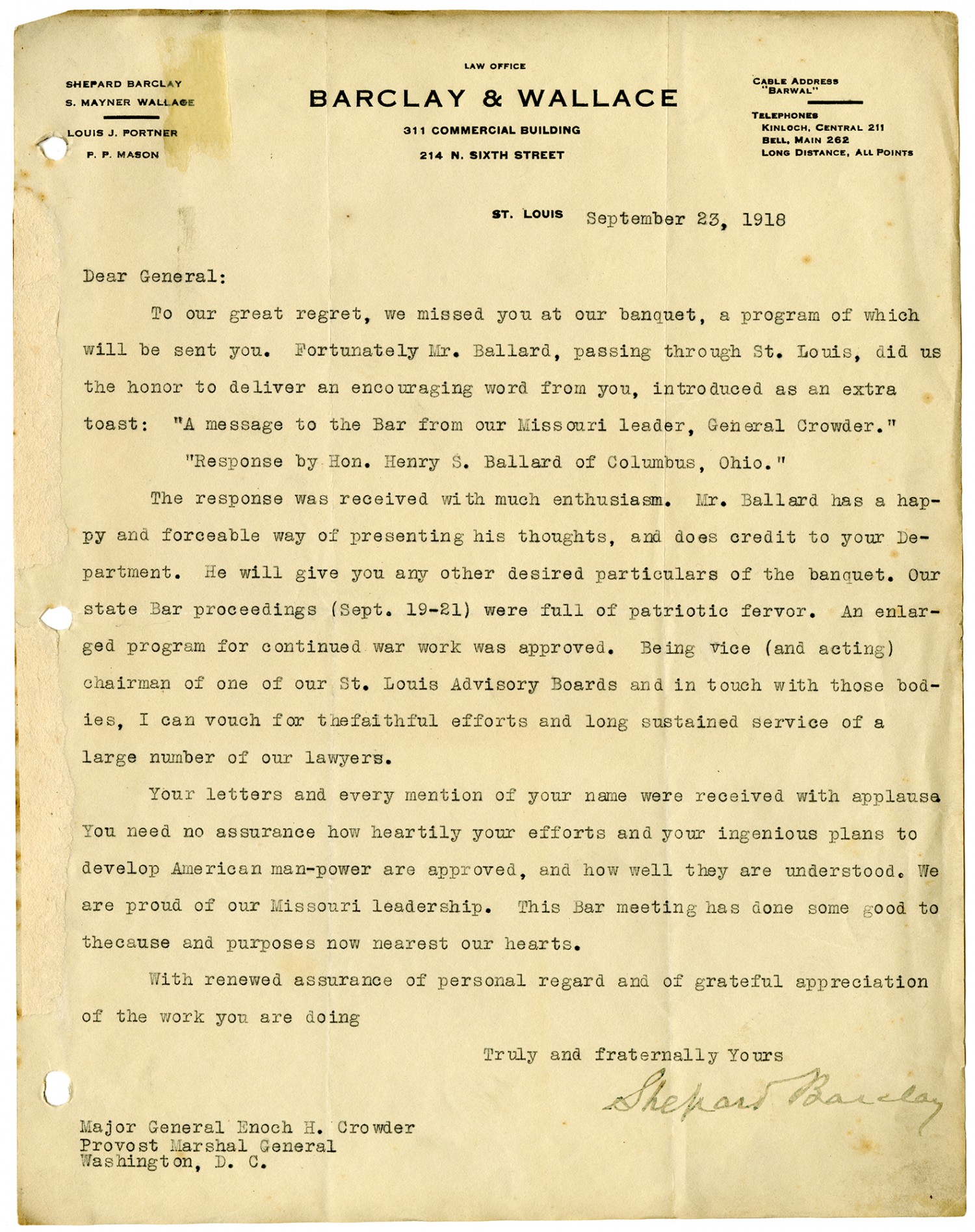 | Source | Barclay, Shepard. Letter to General Enoch H. Crowder from Shepard Barclay. 23 September 1918. Crowder, Enoch H. (1859-1932), Papers, 1884-1942. C1046. The State Historical Society of Missouri, Columbia, MO. |