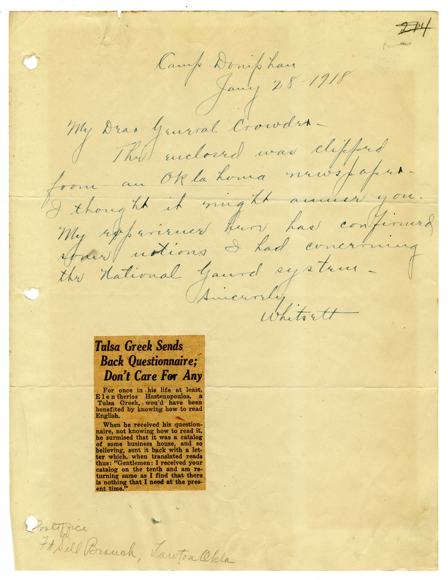 Camp Doniphan July 28 1918 My Dear General Crowder- The enclosed was clipped from an Oklahoma newspaper. I thought it might amuse you. My experience [m.s. illegible; 1 wd] has confirmed some notions I had concerning the National Guard system. Sincerely Whitsett [newspaper clipping included]