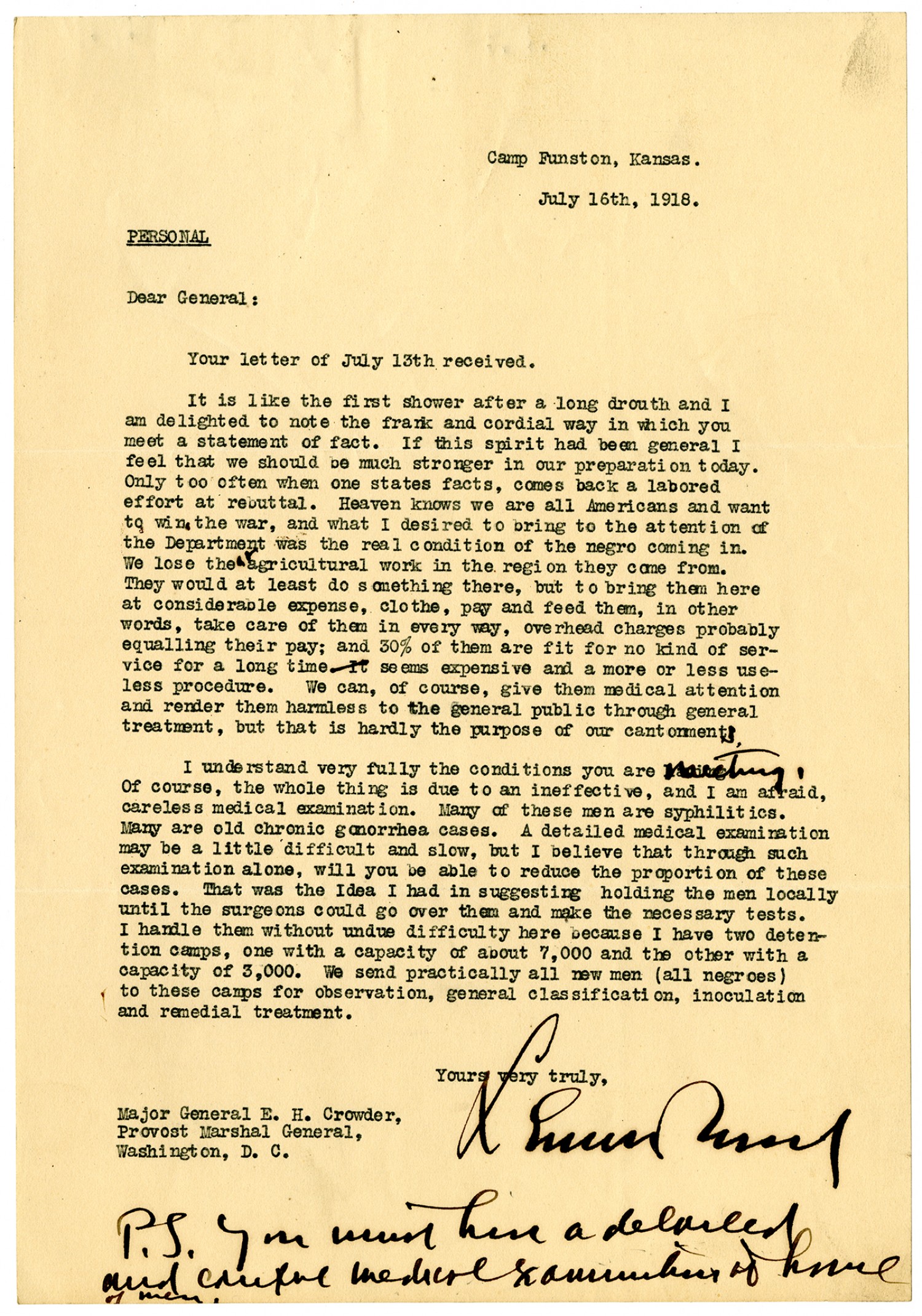 Camp Funston, Kansas. July 16th, 1918. Personal Dear General: Your letter of July 13th received. It is like the first shower after a long drouth and I am delighted to note the frank and cordial way in which you meet a statement of fact. If this spirit had been general I feel that we should be much stronger in our preparation today. Only too often when one states facts, comes back a labored effort at rebuttal. Heaven knows we are all Americans and want to win the war, and what I desired to bring to the attention of the Department was the real condition of the negro coming in. We lost the agricultural work in the region they come from. They would at least do something there, but to bring them here at considerable expense, clothe, pay and feed them, in other words, take care of them in every way, overhead charges probably equalling their pay; and 30% of them are fit for no kind of service for a long time. It seems expensive and a more or less useless procedure. We can, of course, give them medical attention and render them harmless to the general public through general treatment, but that is hardly the purpose of our cantonments. I understand very fully the conditions you are meeting. Of course, the whole thing is due to an ineffective, and I am afraid, careless medical examination. Many of these men are syphilitics. Many are old chronic gonorrhea cases. A detailed medical examination may be a little difficult and slow, but I believe that through such examination alone, will you be able to reduce the proportion of these cases. That was the Idea I had in suggesting holding the men locally until the surgeons could go over them and make the necessary tests. I handle them without undue difficulty here because I have two detention camps, one with a capacity of about 7,000 and the other with a capacity of 3,000. We send practically all new men (all negroes) to these camps for observation, general classification, inoculation and remedial treatment. Yours very truly, [signature illegible] Major General E. H. Crowder, Provost Marshal General, Washington, D.C. P.S. you must hire a [m.s. illegible: 1 wd] and couple medical examinations of [m.s. illegible: 1 wd] of men
