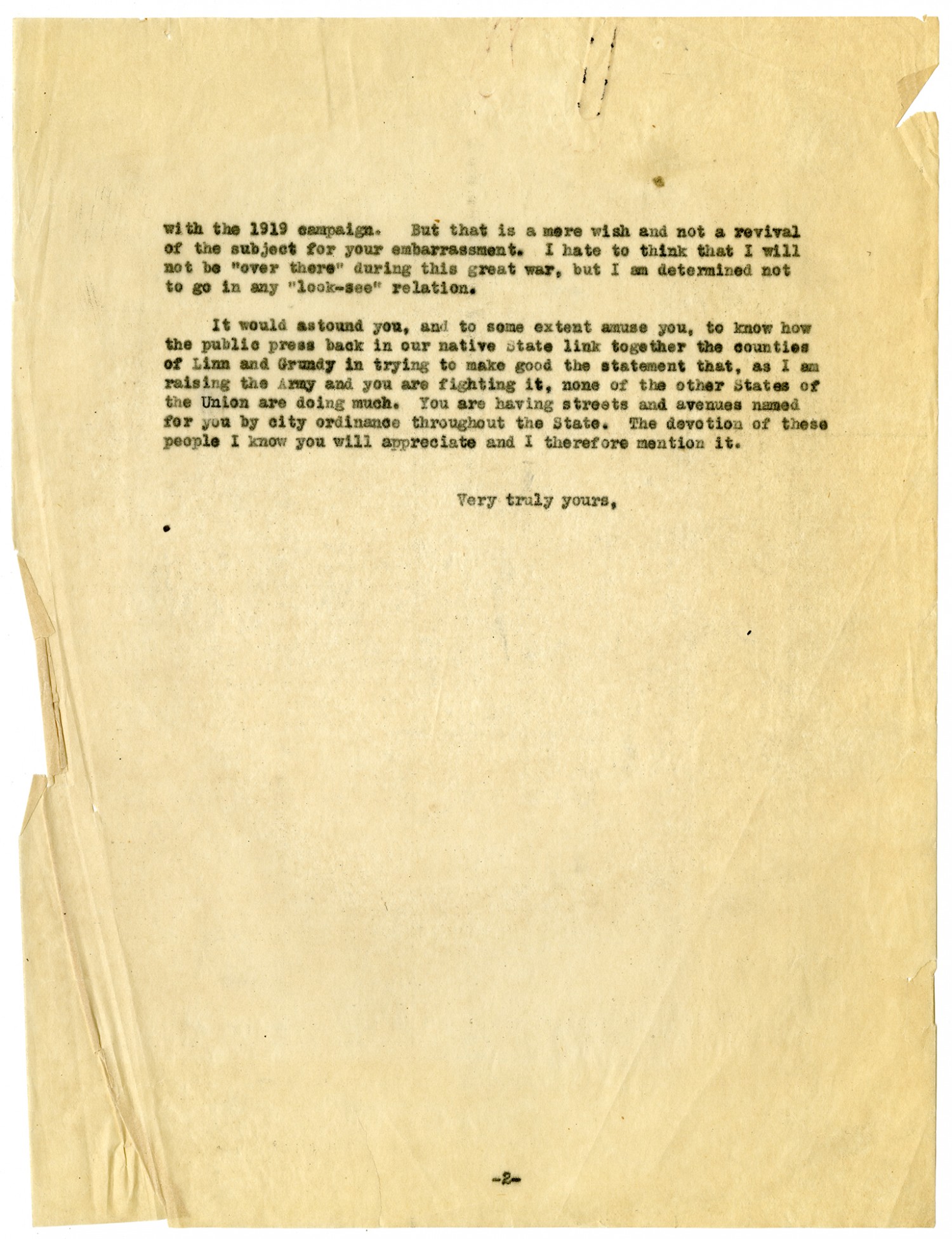 [page 2] with the 1919 campaign. But that is a mere wish and not a revival of the subject for your embarrassment. I hate to think that I will not be