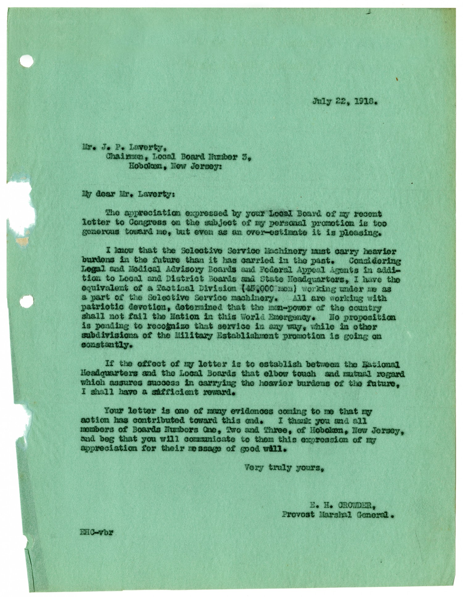 July 22, 1918. Mr. J.P. Laverty, Chairman, Local Board Number 3, Hoboken, New Jersey: My dear Mr. Laverty: The appreciation expressed by your Local Board of my recent letter to Congress on the subject of my personal promotion is too generous toward me, but even as an over-estimate it is pleasing. I know that the Selective Service Machinery must carry heavier burdens in the future than it has carried in the past. Considering Legal and Medical Advisory Boards and Federal Appeal Agents in addition to Local and District Boards and State Headquarters, I have the equivalent of a Tactical Division (45,000) men working under me as a part of the Selective Service machinery. All are working with patriotic devotion, determined that the man-power of the country shall not fail the Nation in this World Emergency. No proposition is pending to recognize that service in any way, while in other subdivisions of the Military Establishment promotion is going on constantly. If the effect of my letter is to establish between the National Headquarters and the Local boards that elbow touch and mutual regard which assures success in carrying the heavier burdens of the future, I shall have a sufficient reward. Your letter is one of many evidences coming to me that my action has contributed toward this end. I thank you and all members of Boards Numbers One, Two and Three, of Hoboken, New Jersey, and beg that you will communicate to them this expression of my appreciation for their message of good will. Very truly yours, E. H. Crowder, Provost Marshal General. EHC-vbr