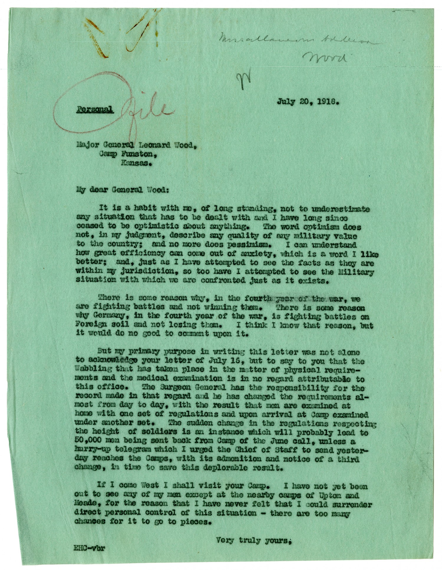 July 20, 1918. Personal Major General Leonard Wood, Camp Funston, Kansas. My dear General Wood: it is a habit with me, of long standing, not to underestimate any situation that has to be dealt with and I have long since ceased to be optimistic about anything. The word optimism does not, in my judgment, describe any quality of any military value to the country; and no more does pessimism. I can understand how great efficiency can come out of anxiety, which is a word I like better; and, just as I have attempted to see the facts as they are within my jurisdiction, so too have I attempted to see the Military situation with which we are confronted just as it exists. There is some reason why, in the fourth year of the war, we are fighting battles and not winning them. There is some reason why Germany, in the fourth year of the war, is fighting battles on Foreign soil and not losing them. I think I know that reason, but it would do no good to comment upon it. But my primary purpose in writing this letter was not alone to acknowledge your letter of July 16, but to say to you that the Wabbling that has taken place in the matter of physical requirements and the medical examination is in no regard attributable to this office. The Surgeon General has the responsibility for the record made in that regard and he has changed the requirements almost from day to day, with the result that men are examined at home with one set of regulations and upon arrival at Camp examined under another set. The sudden change in the regulations respecting the height of soldiers is an instance which will probably lead to 50,000 men being sent back from Camp of the June call, unless a hurry-up telegram which I urged the Chief of Staff to send yesterday reaches the Camps, with its admonition and notice of a third change, in time to save this deplorable result. If I come West I shall visit your Camp. I have not yet been out to see any of my men except at the nearby camps of Upton and Meade, for the reason that I have never felt that I could surrender direct personal control of this situation- there are too many chances for it to go to pieces. Very truly yours, EHC-vbr