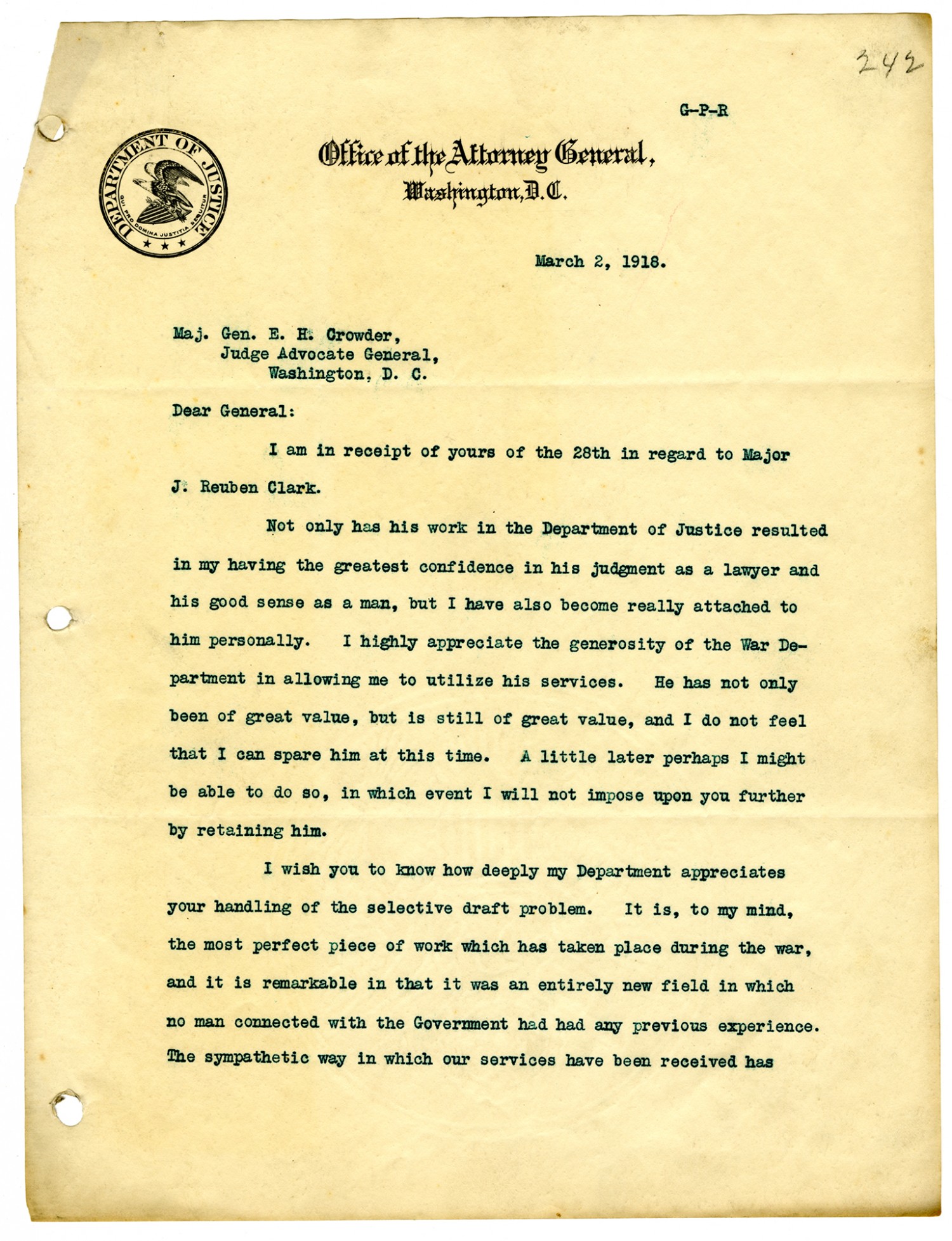 March 2, 1918. Maj. Gen. E. H. Crowder, Judge Advocate General, Washington, D.C. Dear General: I am in receipt of yours of the 28th in regard to Major J. Reuben Clark. Not only has his work in the Department of Justice resulted in my having the greatest confidence in his judgment as a lawyer and his good sense as a man, but I have also become really attached to him personally. I highly appreciate the generosity of the War Department in allowing me to utilize his services. He has not only been of great value, but is still of great value, and I do not feel that I can spare him at this time. A little later perhaps I might be able to do so, in which event I will not impose upon you further by retaining him. I wish you to know how deeply my Department appreciates your handling of the selective draft problem. It is, to my mind, the most perfect piece of work which has taken place during the war, and it is remarkable in that it was an entirely new field in which no man connected with the Government had had any previous experience. The sympathetic way in which our services have been received has