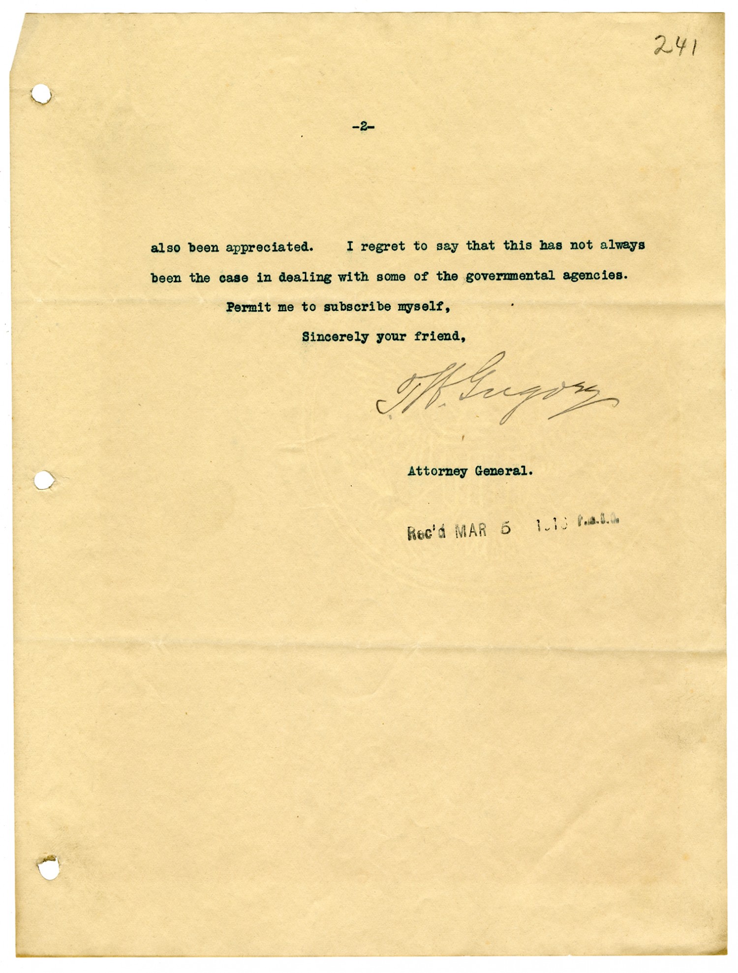 [page 2] also been appreciated. I regret to say that this has not always been the case in dealing with some of the governmental agencies. Permit me to subscribe myself, Sincerely your friend, T. W. Gregory [Thomas Watt Gregory] Attorney General Rec