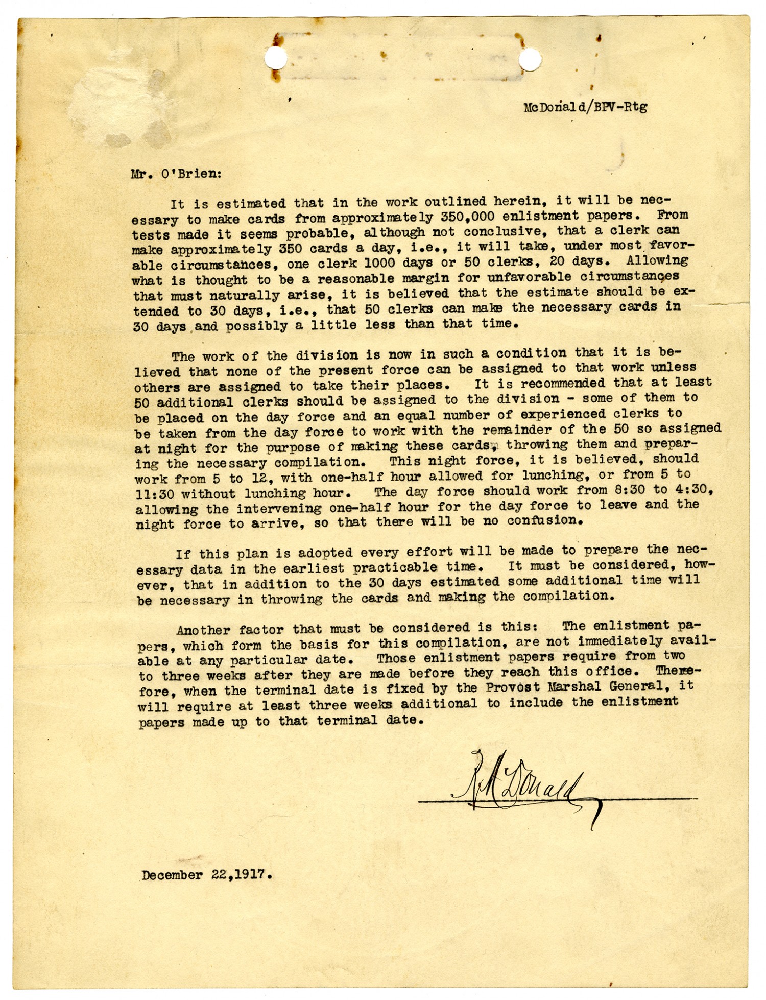 | Description | In this letter, R. McDonald wrote Mr. O'Brien and discussed making cards from approximately 350,000 enlistment papers. He estimated it would take 50 clerks 30 days to accomplish this task. This document is part of a collection compiled by Enoch Herbert Crowder, the Edinburg, Grundy County, Missouri native who served as Judge Advocate General. Crowder devised the Selective Service Act in 1917 which drafted America's forces during World War I. |