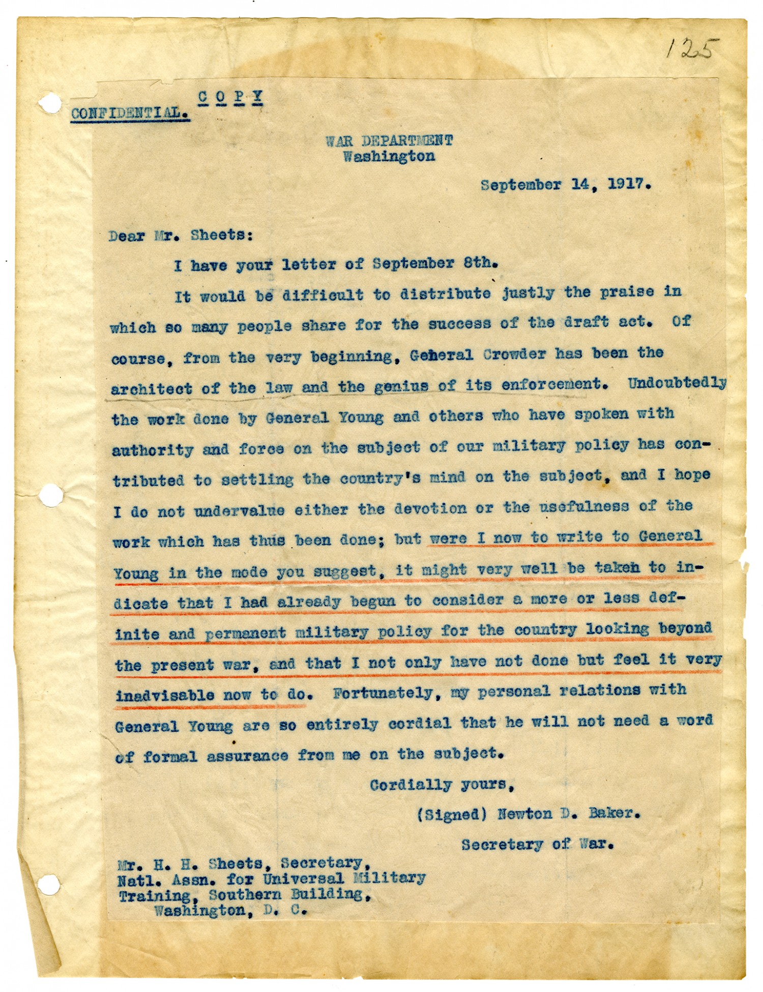 Copy Confidential War Department Washington September 14, 1917. Dear Mr. Sheets: I have your letter of September 8th. It should be difficult to distribute justly the praise in which so many people share for the success of the draft act. Of course, from the very beginning, General Crowder has been the architect of the law and the genius of its enforcement. Undoubtedly the work done by General Young and others who have spoken with authority and force on the subject of our military policy has contributed to settling the country