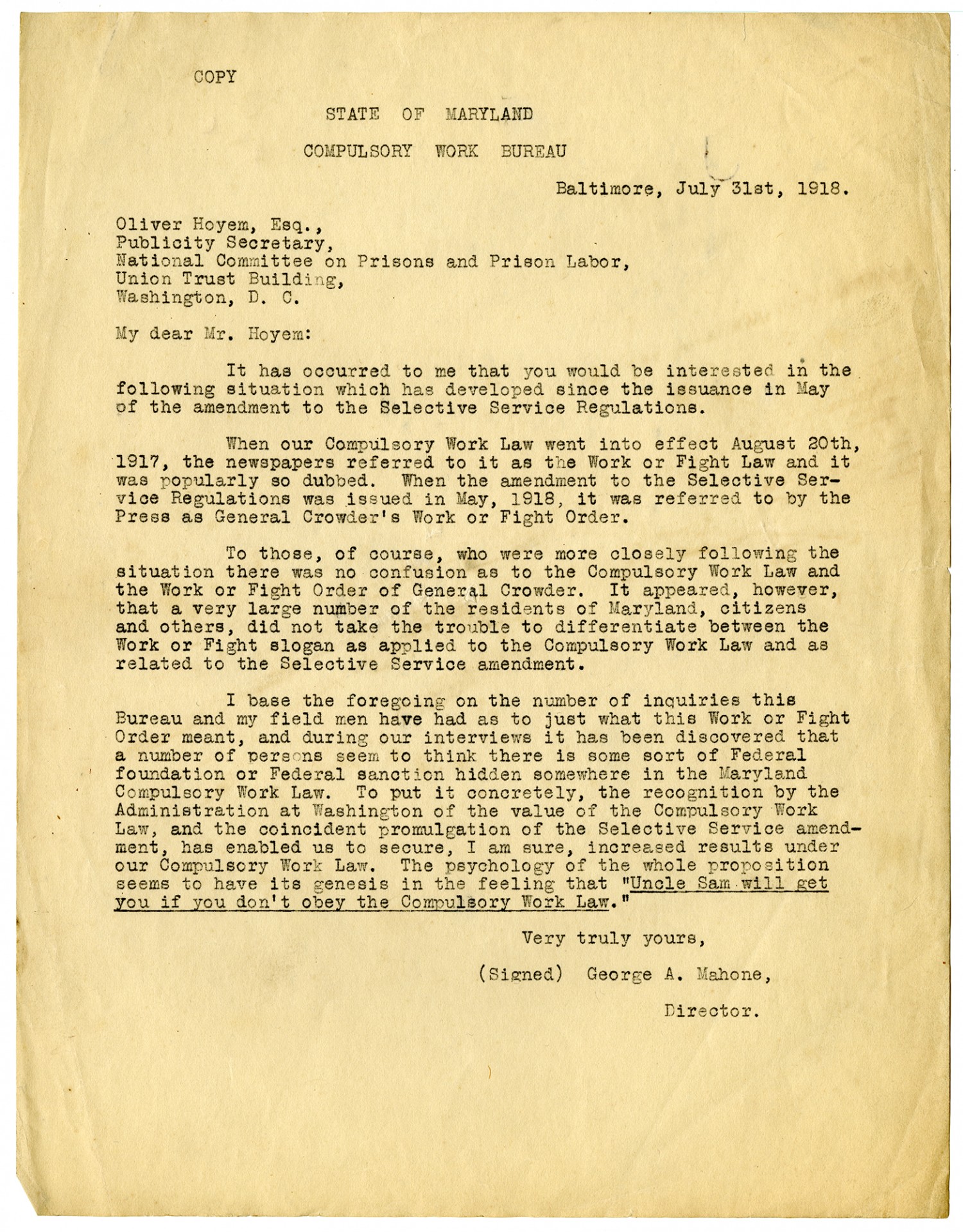 Copy State of Maryland Compulsory Work Bureau Baltimore, July 31, 1918. Oliver Hoyem, Esq., Publicity Secretary, National Committee on Prisons and Prison Labor, Union Trust Building, Washington, D.C. My dear Mr. Hoyem: It has occurred to me that you would be interested in the following situation which has developed since the issuance in May of the amendment to the Selective Service Regulations. When our Compulsory Work Law went into effect August 20th, 1917, the newspapers referred to it as the Work or Fight Law and it was popularly so dubbed. When the amendment to the Selective Service Regulations was issued in May, 1918, it was referred to by the Press as General Crowder