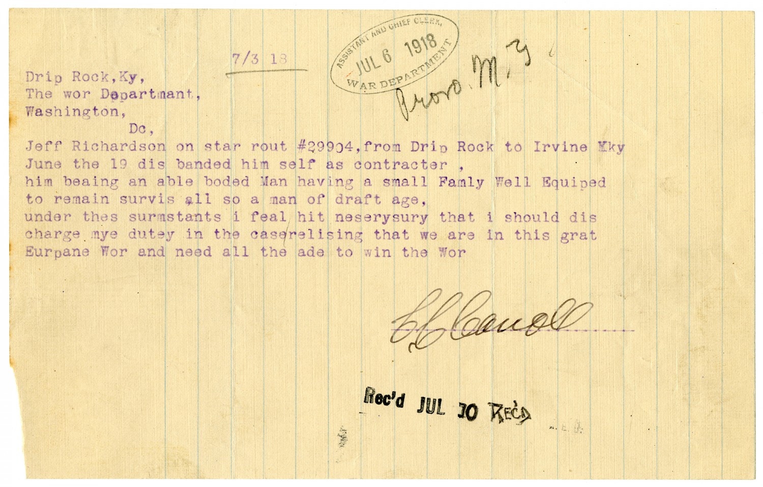 7/3 [1918] Drip Rock, [Kentucky] The wor Departmant, Washington, Dc, Jeff Richardson on star rout #29904, from Drip Rock to Irvine [Kentucky] June the 19 dis banded him self as contracter, him beaing an able boded Man having a small Famly Well Equiped to remain survis all so a man of draft age, under thes surmstants i feal hit neserysury that i should dis charge mye dutey in the case relising that we are in this grat Eurpane Wor and need all the ade to win the Wor C.C. Carol