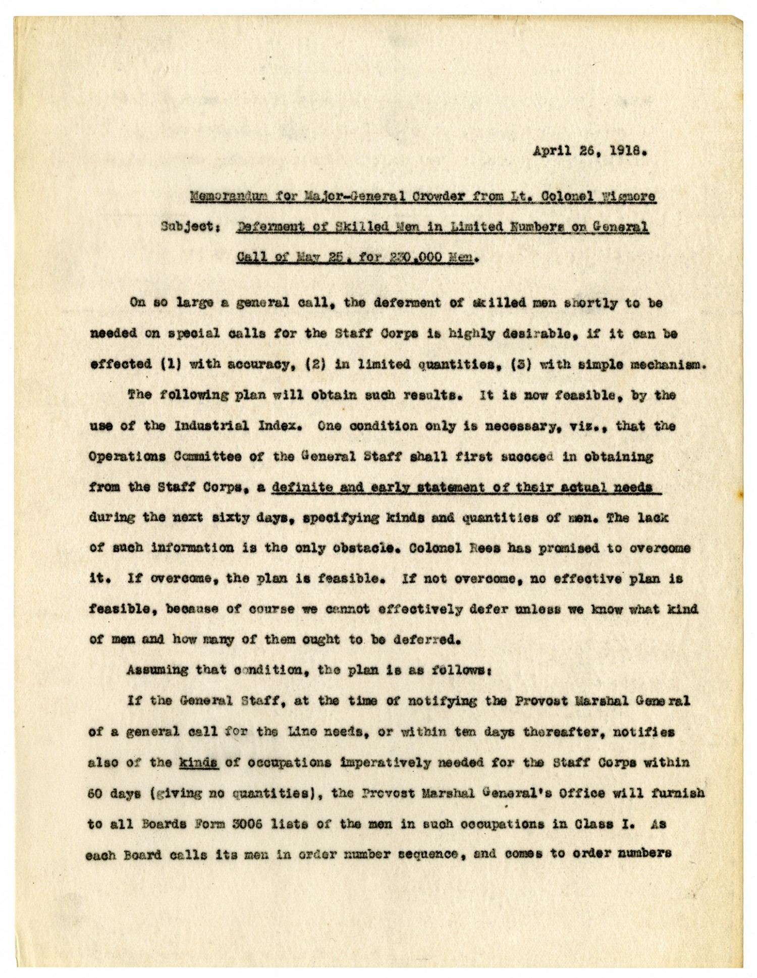April 26, 1918. Memorandum for Major-General Crowder from Lt. Colonel Wigmore Subject: Deferment of Skilled Men in Limited Numbers on General Call of May 25, for 230,000 Men. On so large a general call, the deferment of skilled men shortly to be needed on special calls for the Staff Corps is highly desirable, if it can be effected (1) with accuracy, (2) in limited quantities, (3) with simple mechanism. The following plan will obtain such results. It is not feasible, by the use of the Industrial Index. One condition only is necessary, viz., that the Operations Committee of the General Staff shall first succeed in obtaining from the Staff Corps, a definite and early statement of their actual needs during the next sixty days, specifying kinds and quantities of men. The lack of such information is the only obstacle. Colonel Rees has promised to overcome it. If overcome, the plan is feasible. If not overcome, no effective plan is feasible, because of course we cannot effectively defer unless we know what kind of men and how many of them ought to be deferred. Assuming that condition, the plan is as follows: If the General Staff, at the time of notifying the Provost Marshal General of a general call for the Line needs, or within ten days thereafter, notifies also of the kinds of occupations imperatively needed for the Staff Corps within 60 days (giving no quantities), the Provost Marshal General