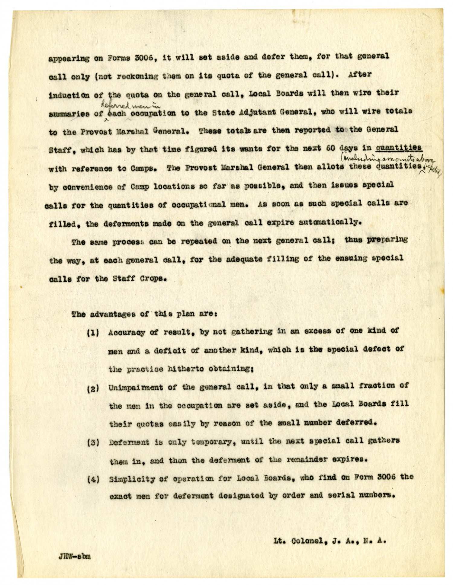 appearing on Forms 3006, it will set aside and defer them, for that general call only (not reckoning them on its quota of the general call). After induction of the quota on the general call, Local Boards will then wire their summaries of referred men in each occupation to the State Adjutant General, who will wire totals to the Provost Marshal General. These totals are then reported to the General Staff, which has by that time figured its wants for the next 60 days in quantities with reference to Camps. The Provost Marshal General then allots these quantities, including amounts above reported by convenience of Camp locations so far as possible, and then issues special calls for the quantities of occupational men. As soon as such special calls are filled, the deferments made on the general call expire automatically. The same process can be repeated on the next general call; thus preparing the way, at each general call, for the adequate filling of the ensuing special calls for the Staff Crops. The advantages of this plan are: (1) Accuracy of result, by not gathering in an excess of one kind of men and a deficit of another kind, which is the special defect of the practice hitherto obtaining. (2) Unimpairment of the general call, in that only a small fraction of the men in the occupation are set aside, and the Local Boards fill their quotas easily by reason of the small number deferred. (3) Deferment is only temporary, until the next special call gathers them in, and then the deferment of the remainder expires. (4) Simplicity of operation for Local Boards, who find on Form 3006 the exact men for deferment designated by order and serial numbers. Lt. Colonel, J.A., N.A. JHW-sbm