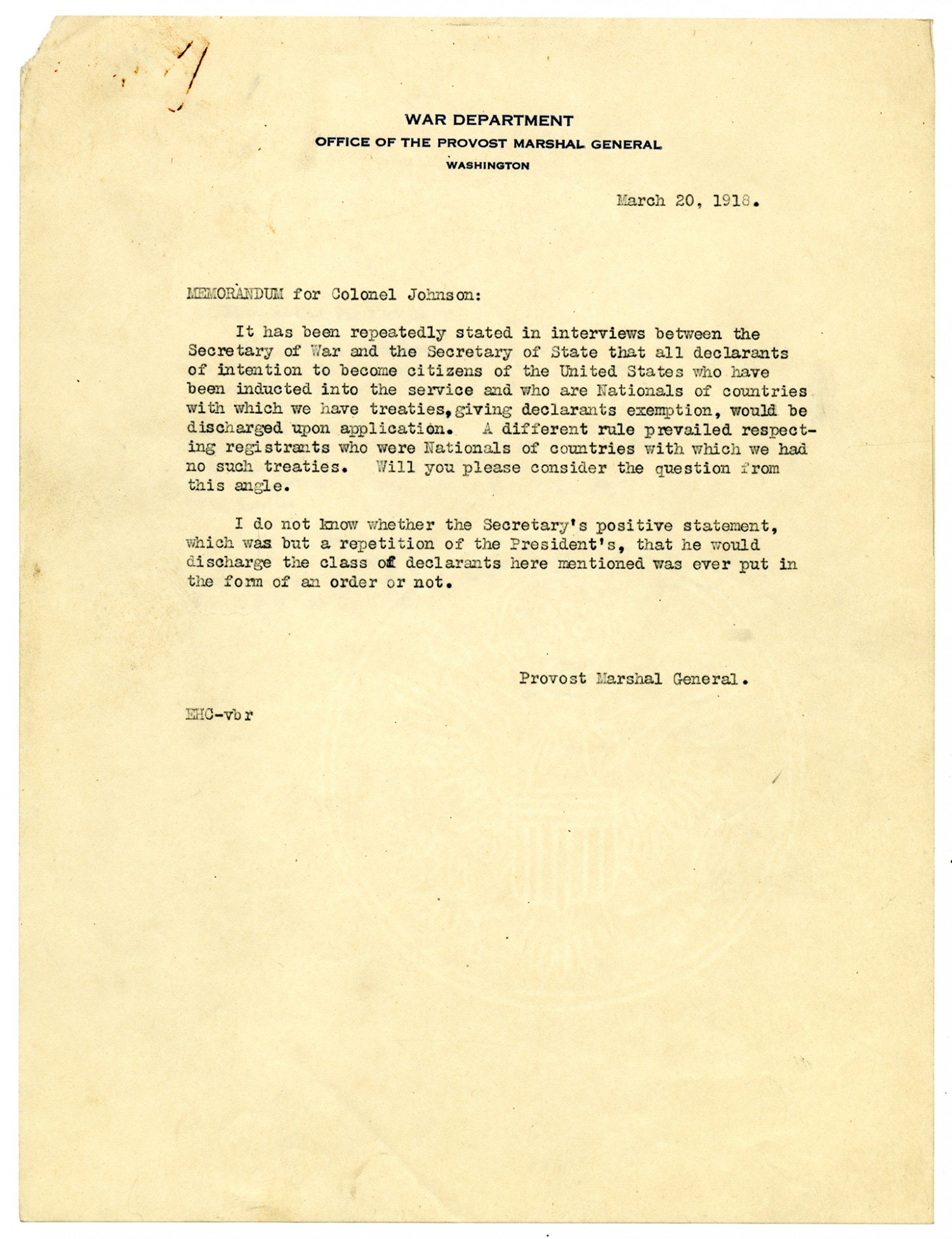 March 20, 1918. Memorandum for Colonel Johnson: It has been repeatedly stated in interviews between the Secretary of War and the Secretary of State that all declarants of intention to become citizens of the United States who have been inducted into the service and who are Nationals of countries with which we have treaties, giving declarants exemption, would be discharged upon application. A different rule prevailed respecting registrants who were Nationals of countries with which we had no such treaties. Will you please consider the question from this angle. I do not know whether the Secretary