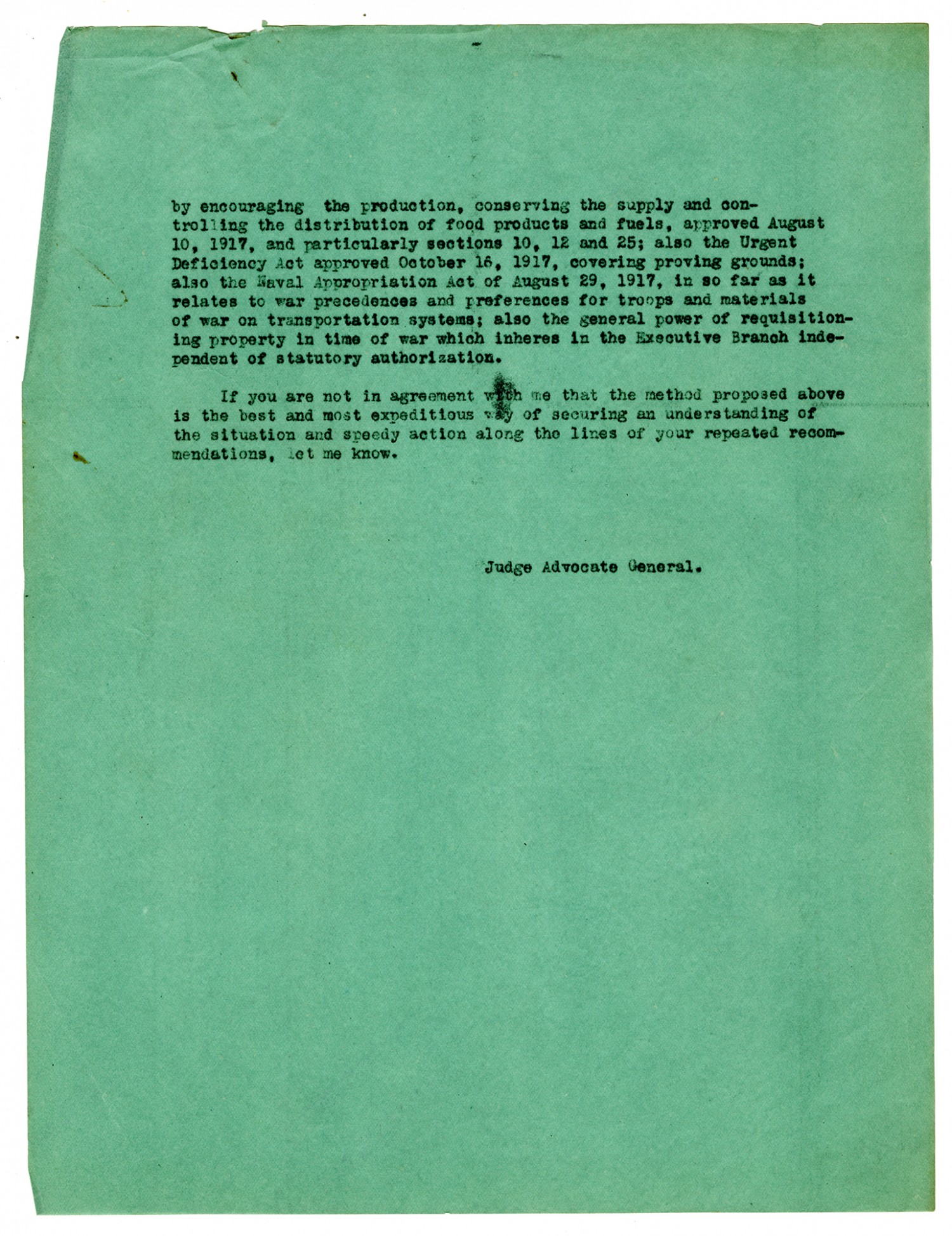 by encouraging the production, conserving the supply and controlling the distribution of food products and fuels, approved August 10, 1917, and particularly sections 10, 12 and 25; also the Urgent Deficiency Act approved October 16, 1917, covering proving ground; also the Naval Appropriation Act of August 29, 1917, in so far as it relates to war precedences and preferences for troops and materials of war on transportation systems; also the general power of requisitioning property in time of war which inheres in the Executive Branch independent of statutory authorization. If you are not in agreement with me that the method proposed above is the best and most expeditious way of securing an understanding of the situation and speedy action along the lines of your repeated recommendations, let me know. Judge Advocate General.