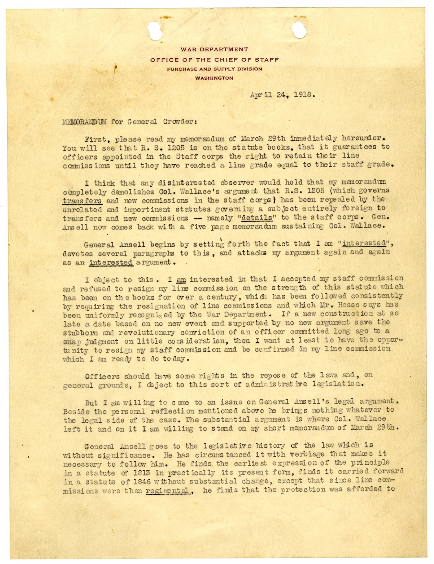 April 24, 1918. Memorandum for General Crowder: First please read my memorandum of March 29th immediately hereunder. You will see that R.S. 1205 is on the statute books, that it guarantees to officers appointed in the Staff corps the right to retain their line commissions until they have reached a line grade equal to their staff grade. I think that any disinterested observer would hold that my memorandum completely demolishes Col. Wallace