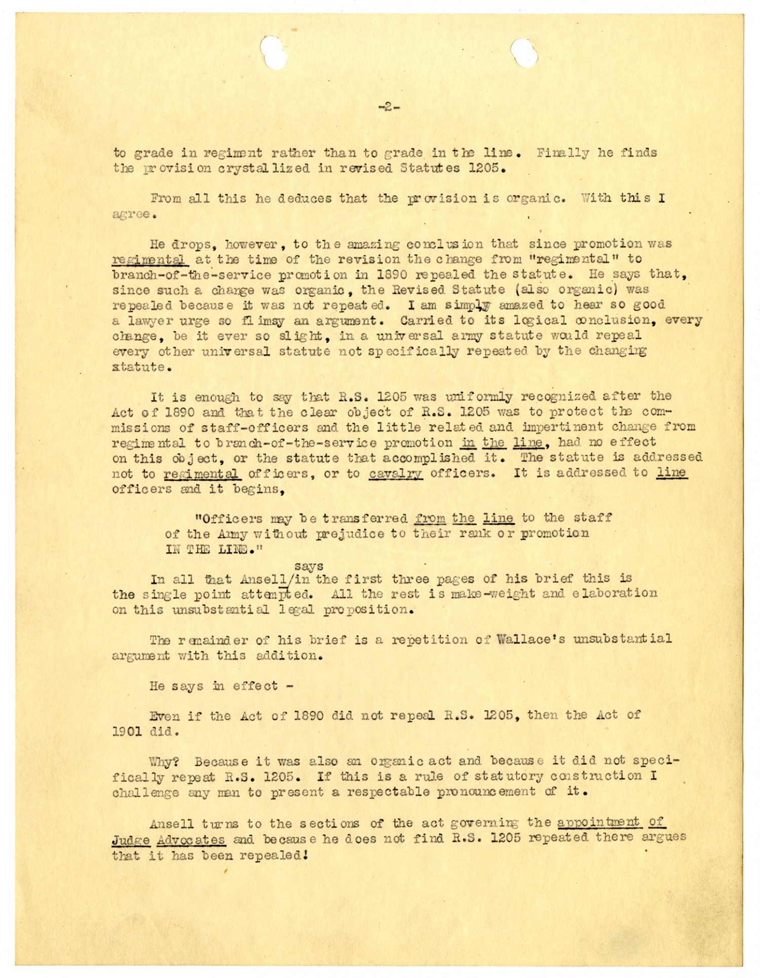 [page 2] to grade in regiment rather than to grade in the line. Finally he finds the provision crystallized in revised Statutes 1205. From all this he deduces that the provision is organic. With this I agree. He drops, however, to the amazing conclusion that since promotion was regimental at the time of the revision the change from