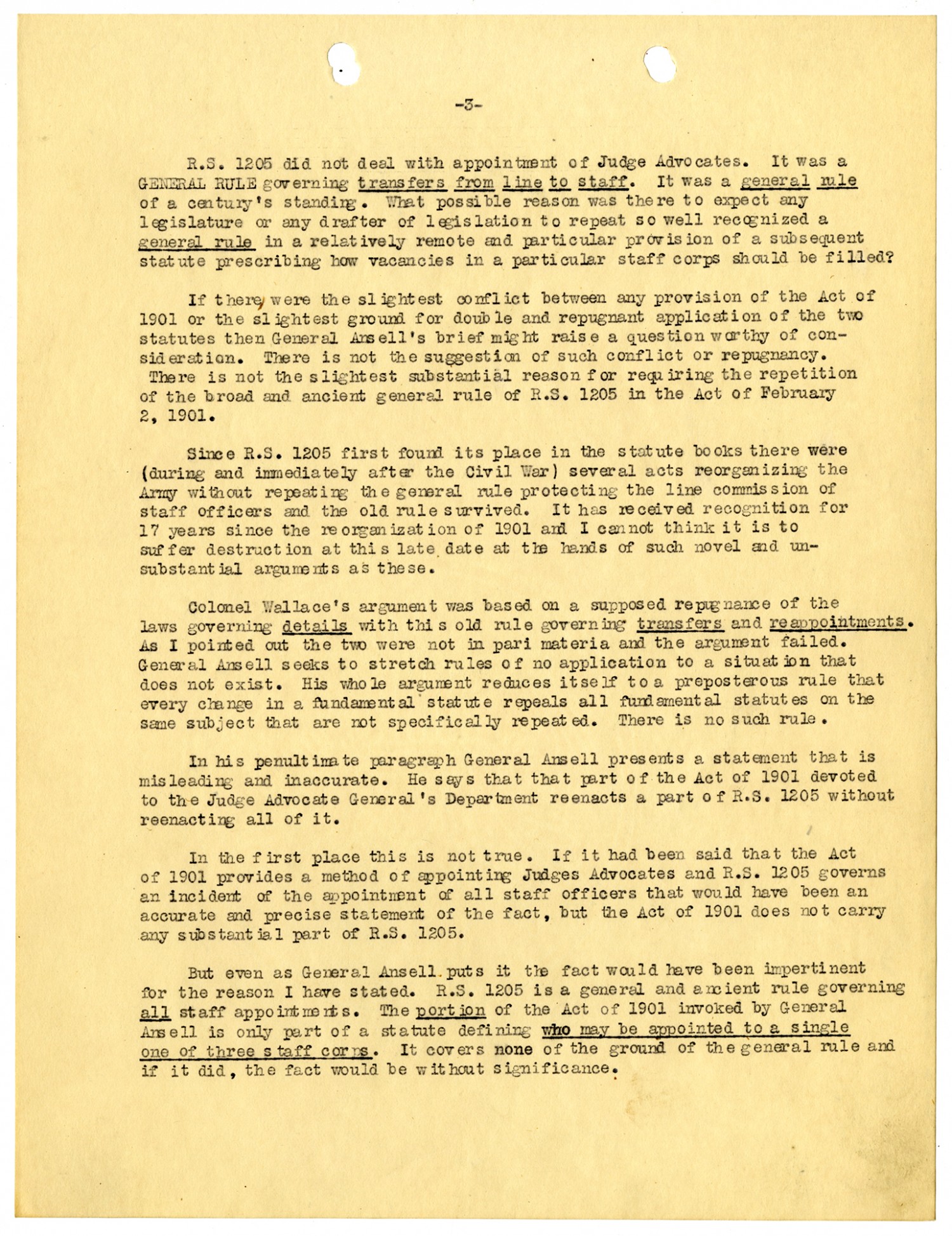 [page 3] R.S. 1205 did not deal with appointment of Judge Advocates. It was a General Rule governing transfers from line to staff. It was a general rule of a century