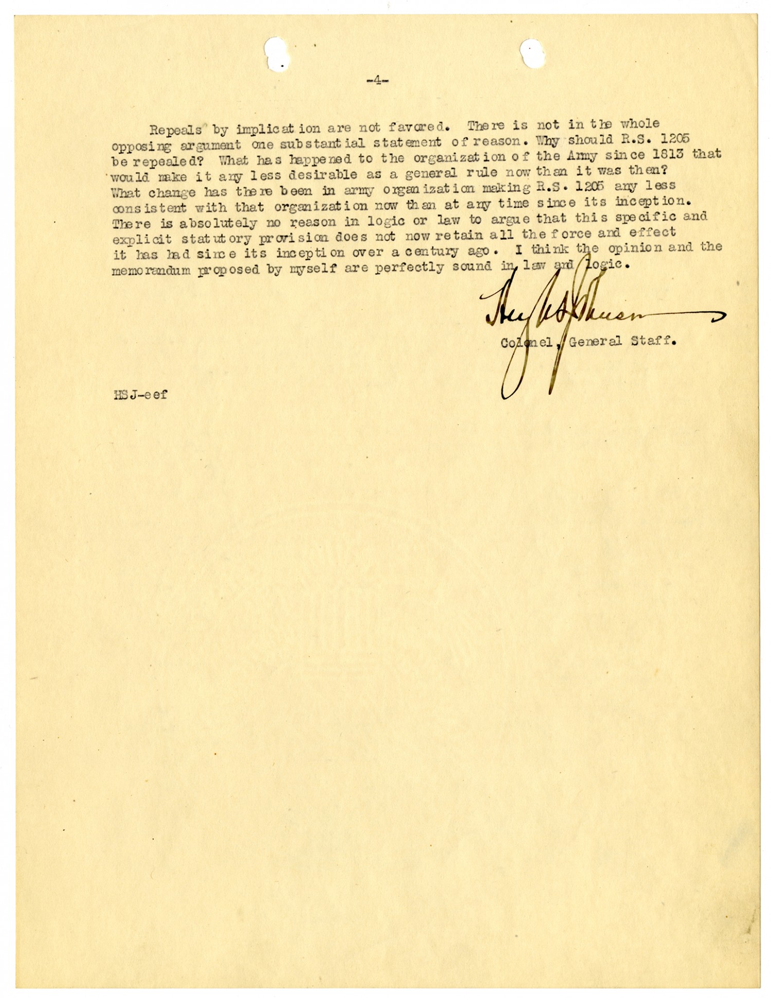 [page 4] Repeals by implication are not favored. There is not in the whole opposing argument one substantial statement of reason. Why should R.S. 1205 be repealed? What has happened to the organization of the Army since 1813 that would make it any less desirable as a general rule now than it was then? What change has there been in army organization making R.S. 1205 any less consistent with that organization now than at any time since its inception. There is absolutely no reason in logic or law to argue that this specific and explicit statutory provision does not now retain all the force and effect it has had since its inception over a century ago. I think the opinion and the memorandum proposed by myself are perfectly sound in law and logic. Hugh S. Johnson Colonel, General Staff. HSJ-eef