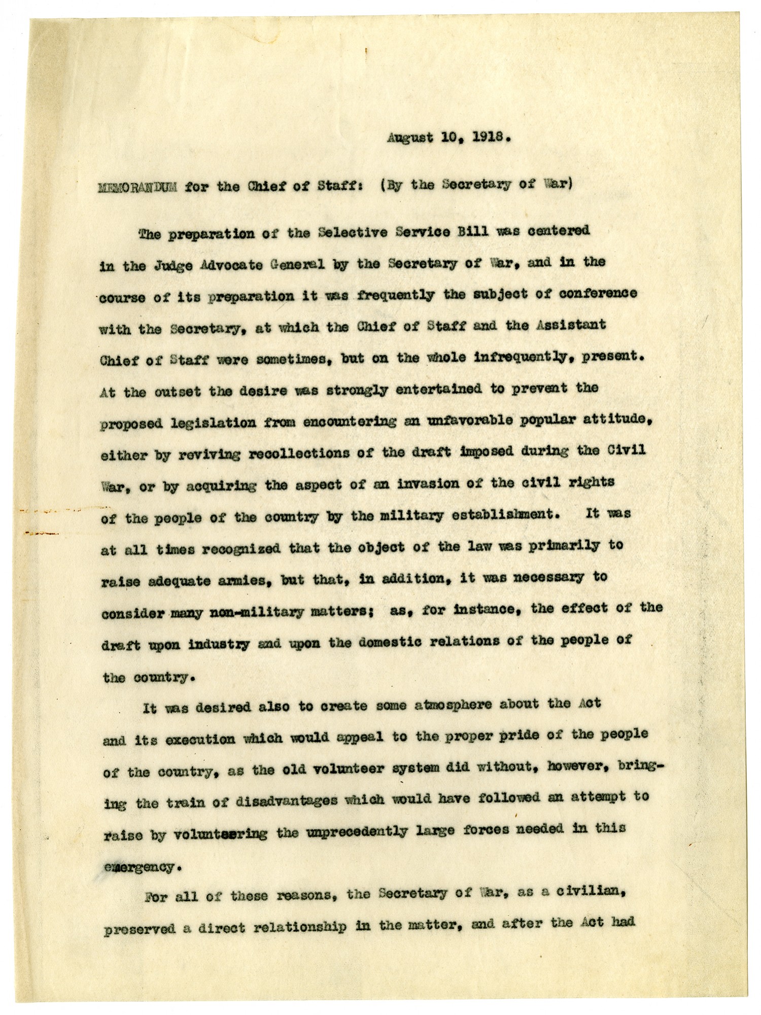 August 10, 1918. Memorandum for the Chief of Staff: (By the Secretary of War) The preparation of the Selective Service Bill was centered in the Judge Advocate General by the Secretary of War, and in the course of its preparation it was frequently the subject of conference with the Secretary, at which the Chief of Staff and the Assistant Chief of Staff were sometimes, but on the whole infrequently, present. At the outset the desire was strongly entertained to prevent the proposed legislation from encountering an unfavorable popular attitude, either by reviving recollections of the draft imposed during the Civil War or by acquiring the aspect of an invasion of the civil rights of the people of the country by the military establishment. It was at all times recognized that the object of the law was primarily to raise adequate armies, but that, in addition, it was necessary to consider many non-military matters; as, for instance, the effect of the draft upon industry and upon the domestic relations of the people of the country. It was desired also to create some atmosphere about the Act and its execution which would appeal to the proper pride of the people of the country, as the old volunteer system did without, however, bringing the train of disadvantages which would have followed an attempt to raise by volunteering the unprecedently large forces needed in this emergency. For all of these reasons, the Secretary of War, as a civilian, preserved a direct relationship in the matter, and after the Act had