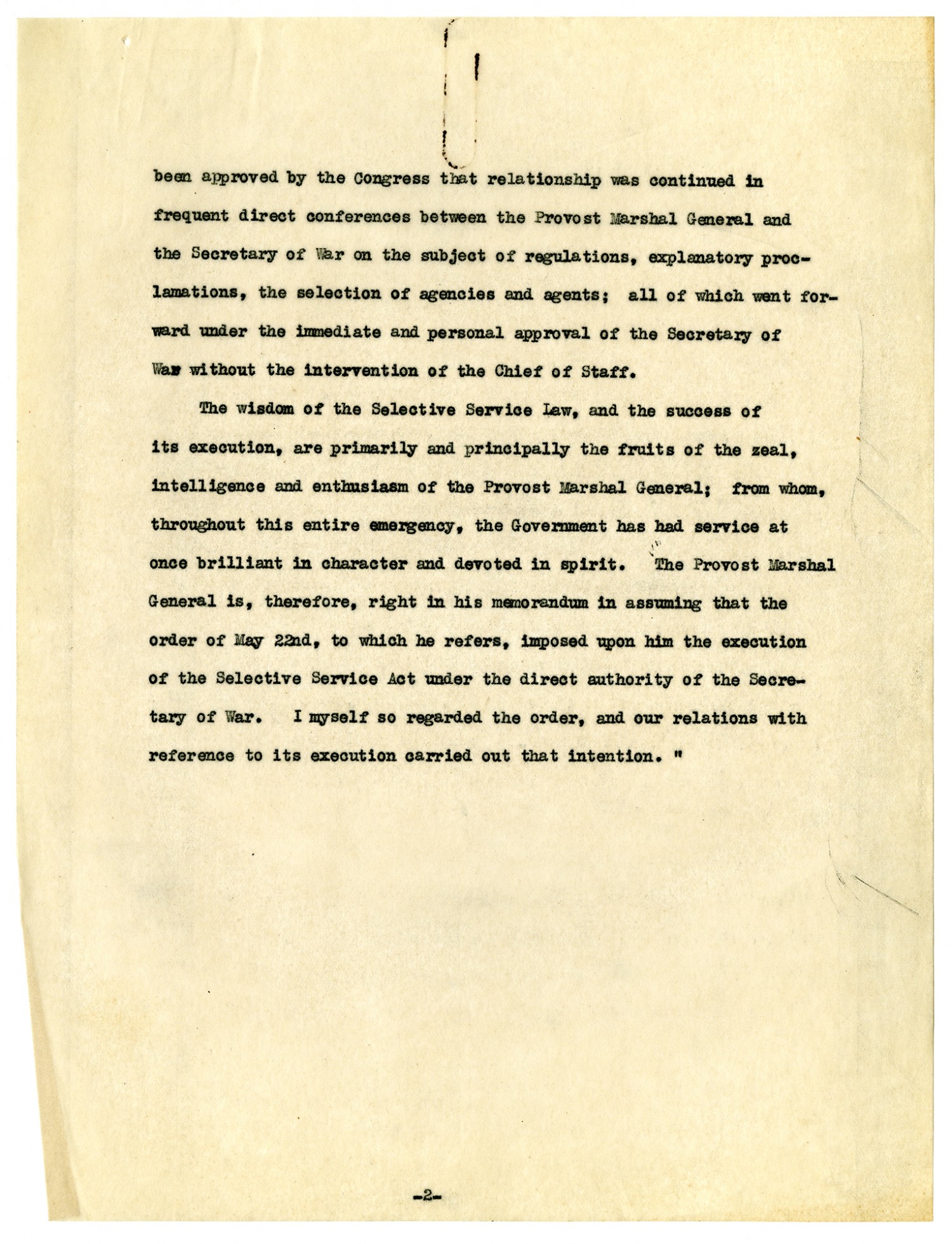 [page 2] been approved by the Congress that relationship was continued in frequent direct conferences between the Provost Marshal General and the Secretary of War on the subject of regulations, explanatory proclamations, the selection of agencies and agents; all of which went forward under the immediate and personal approval of the Secretary of War without the intervention of the Chief of Staff. The wisdom of the Selective Service Law, and the success of its execution, are primarily and principally the fruits of the zeal, intelligence and enthusiasm of the Provost Marshal General; from whom, throughout this entire emergency, the Government has had service at once brilliant in character and devoted in spirit. The Provost Marshal General is, therefore, right in his memorandum in assuming that the order of May 22nd, to which he refers, imposed upon him the execution of the Selective Service Act under the direct authority of the Secretary of War. I myself so regarded the order, and our relations with reference to its execution carried out that intention.
