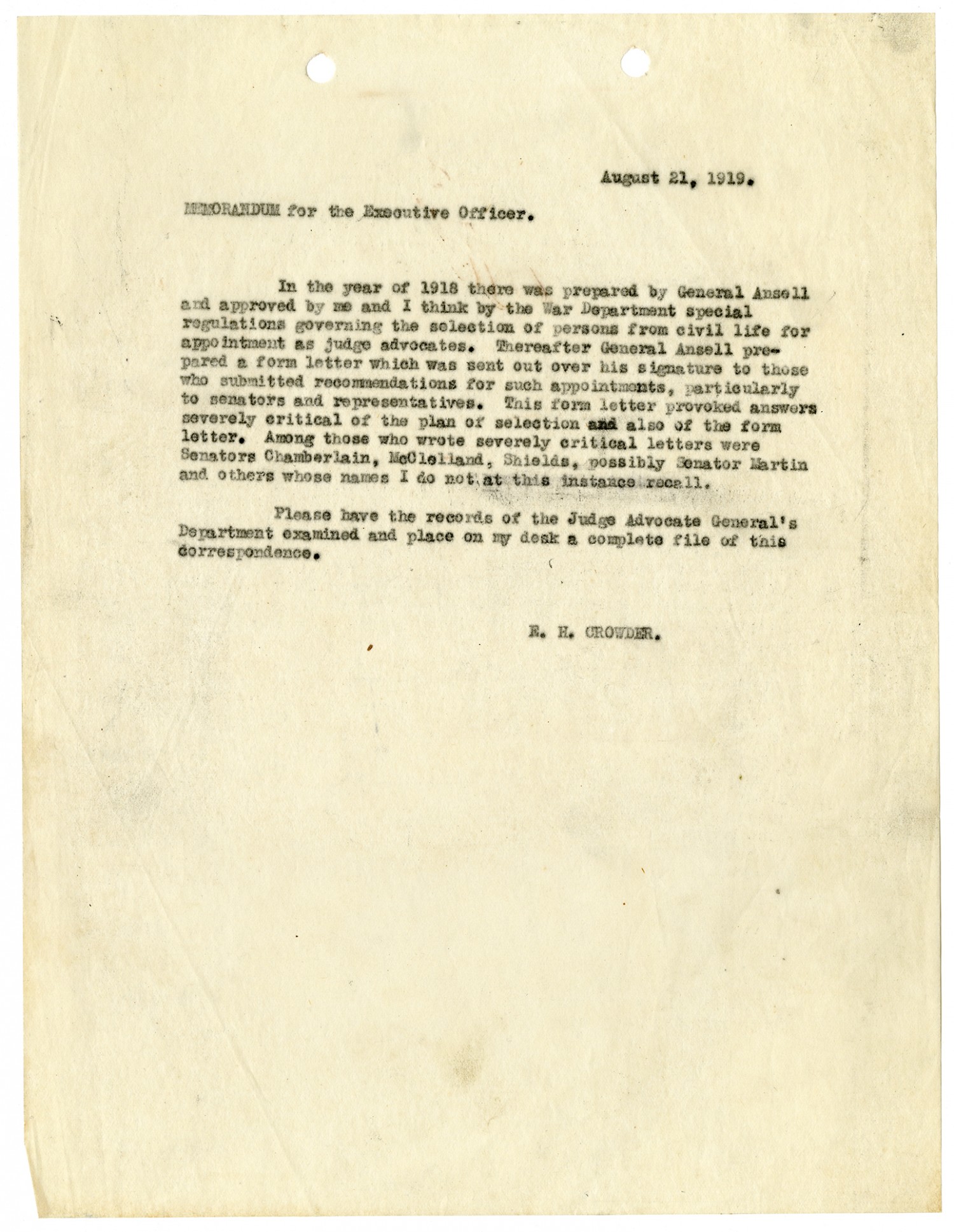 August 21, 1919. Memorandum for the Executive Officer. In the year of 1918 there was prepared by General Ansell and approved by me and I think by the War Department special regulations governing the selection of persons from civil life for appointment as judge advocates. Thereafter General Ansell prepared a form letter which was sent out over his signature to those who submitted recommendations for such appointments, particularly to senators and representatives. This form letter provoked answers severely critical of the plan of selection and also of the form letter. Among those who wrote severely critical letters were Senators Chamberlain, McClelland, Shields, possibly Senator Martin and others whose names I do not at this instance recall. Please have the records of the Judge Advocate General