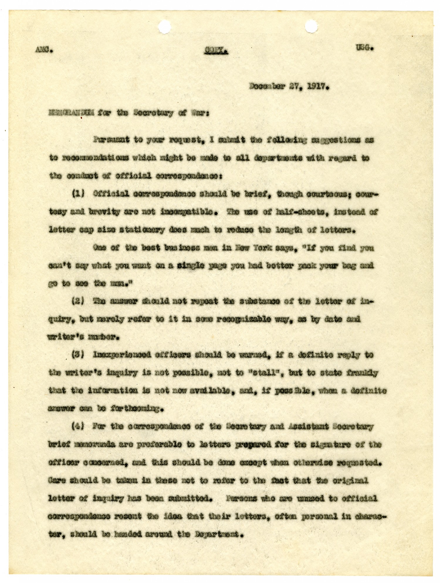 AMC. Copy. USG. December 27, 1917. Memorandum for the Secretary of War: Pursuant to your request, I submit the following suggestions as to recommendations which might be made to all departments with regard to the conduct of official correspondence: (1) Official correspondence should be brief, though courteous; courtesy and brevity are not incompatible. The use of half-shoots, instead of letter cap size stationary does much to reduce the length of letters. One of the best business men in New York says,
