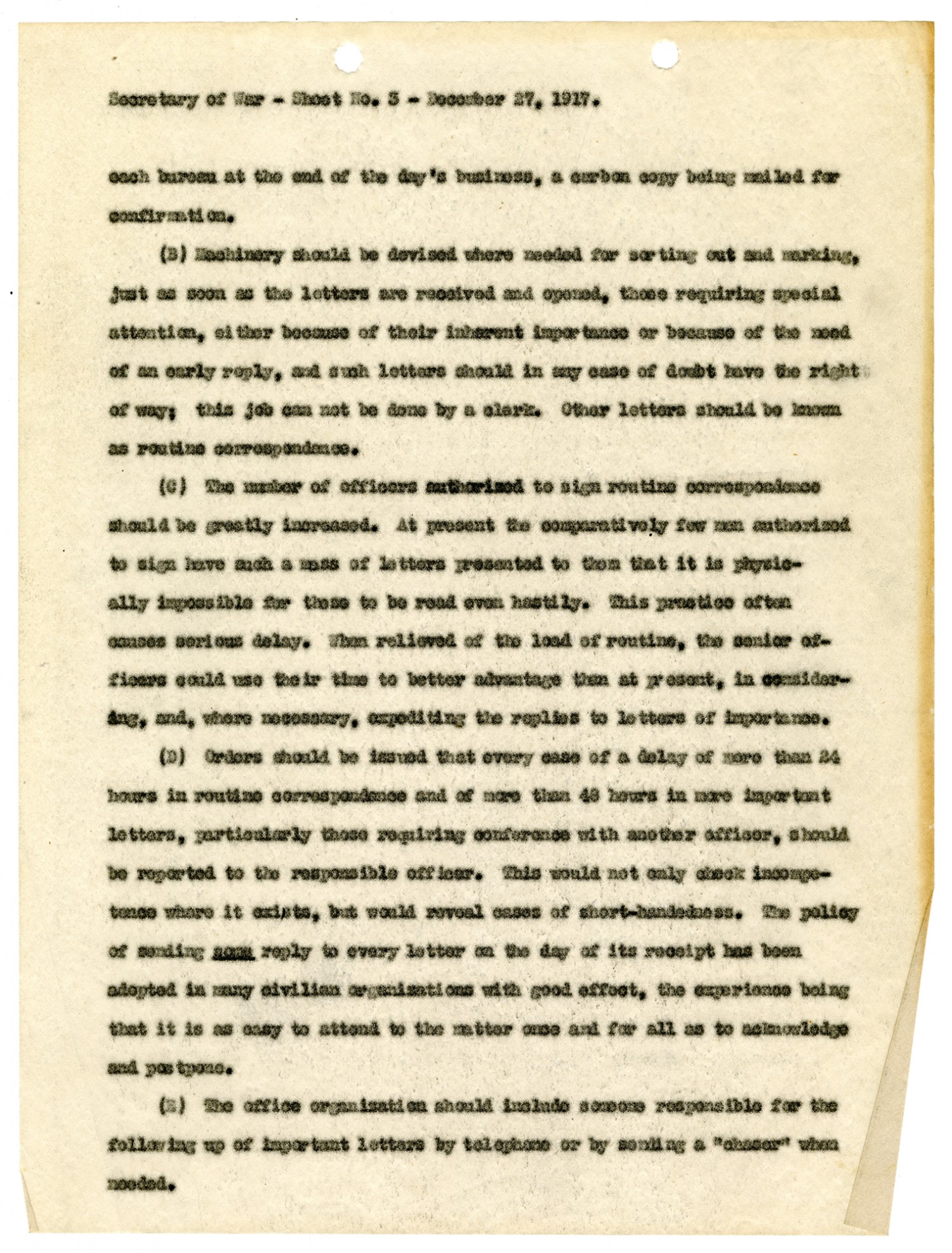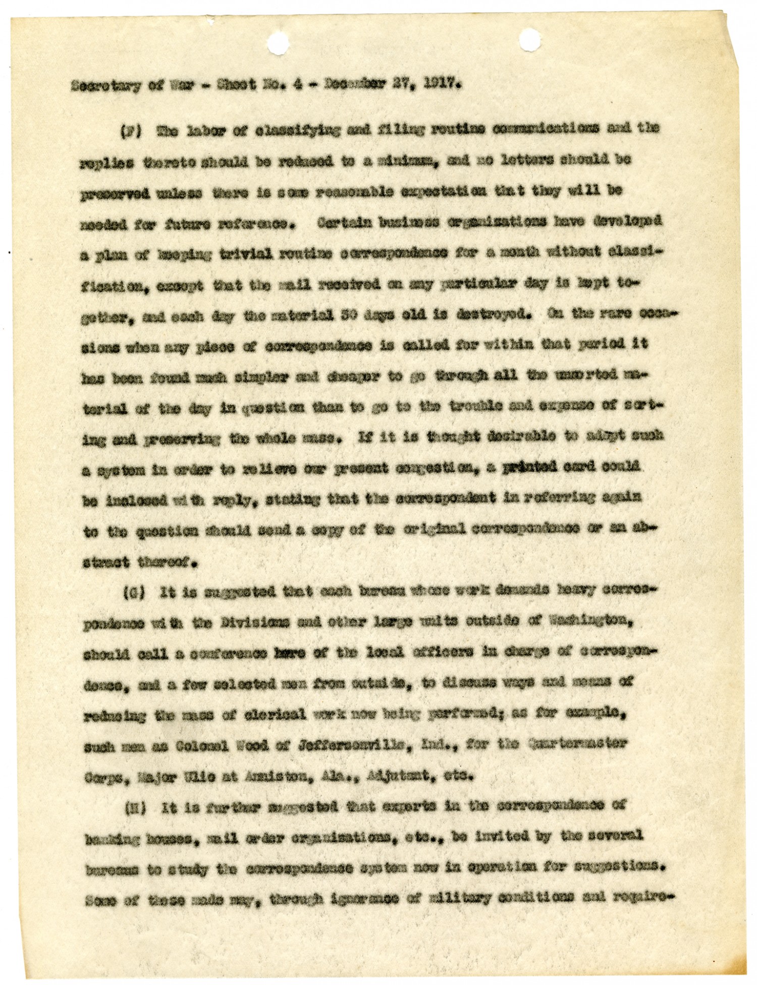 Secretary of War-Sheet No. 4-December 27, 1917. (F) The labor of classifying and filing routine communications and the replies thereto should be reduced to a minimum, and no letters should be preserved unless there is some reasonable expectation that they will be needed for future reference. Certain business organizations have developed a plan of keeping trivial routine correspondence for a month without classification, except that the mail received on any particular day is kept together, and each day the material 30 days old is destroyed. On the rare occasions when any piece of correspondence is called for within that period it has been found much simpler and cheaper to go through all the unsorted material of the day in question than to go to the trouble and expense of sorting and preserving the whole mass. If it is though desirable to adopt such a system in order to relieve our present congestion, a printed card could be inclosed with replay, stating that the correspondent in referring again to the question should send a copy of the original correspondence or an abstract thereof. (G) It is suggested that each bureau whose work demands heavy correspondence with the Divisions and other large units outside of Washington, should call a conference here of the local officers in charge of correspondence, and a few selected men from outside, to discuss ways and means of reducing the mass of clerical work now being performed; as for example, such men as Colonel Wood of Jeffersonville, [Indiana]., for the Quartermaster Corps, Major Ulie at Amiston, [Alabama], Adjutant, etc. (H) It is further suggested that experts in the correspondence of banking houses, mail order organizations, etc., be invited by the several bureaus to study the correspondence system now in operation for suggestions. Some of these made may, through ignorance of military conditions and require-