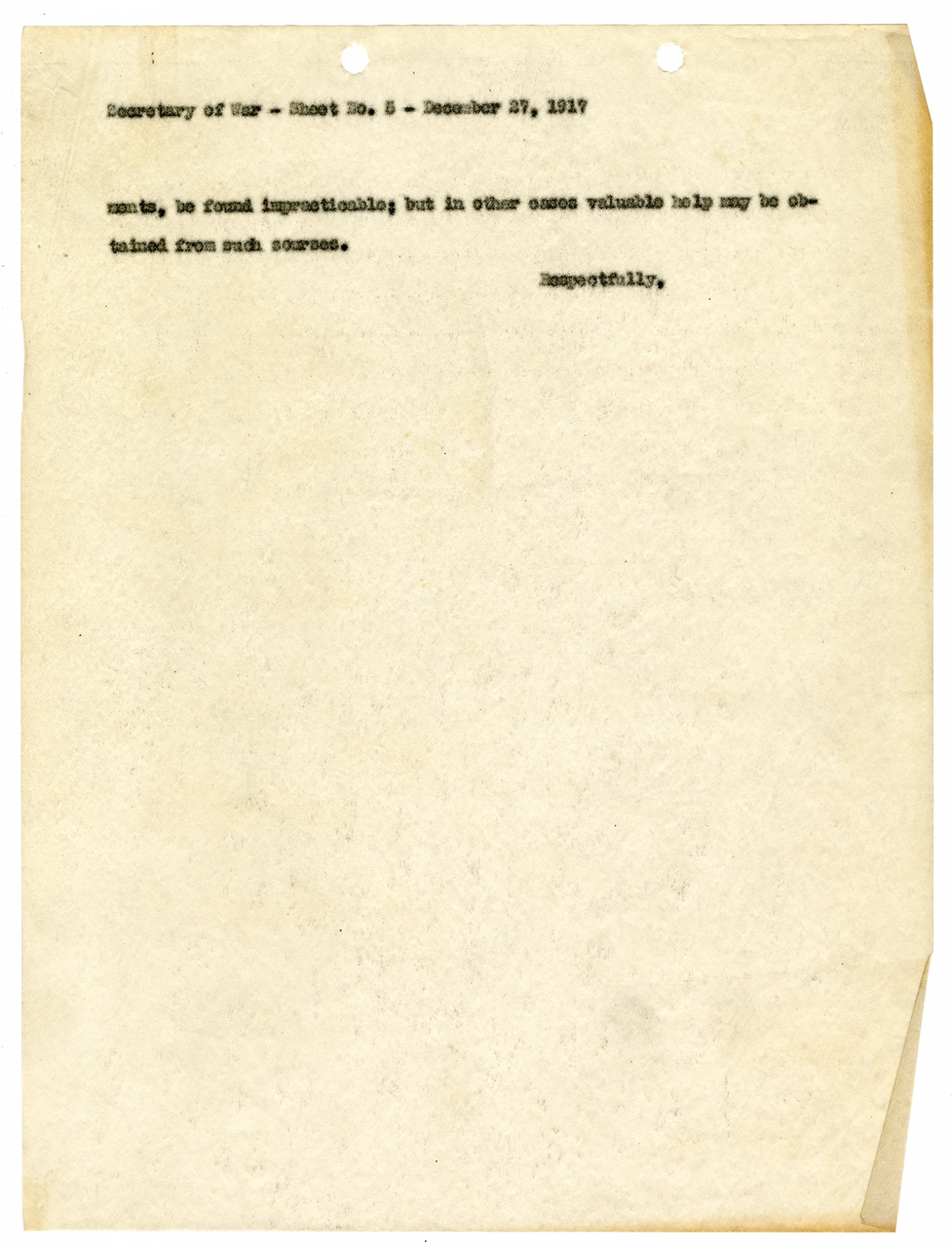 Secretary of War-Sheet No. 5-December 27, 1917. ments, be found impracticable; but in other cases valuable help may be obtained from such sources. Respectfully,