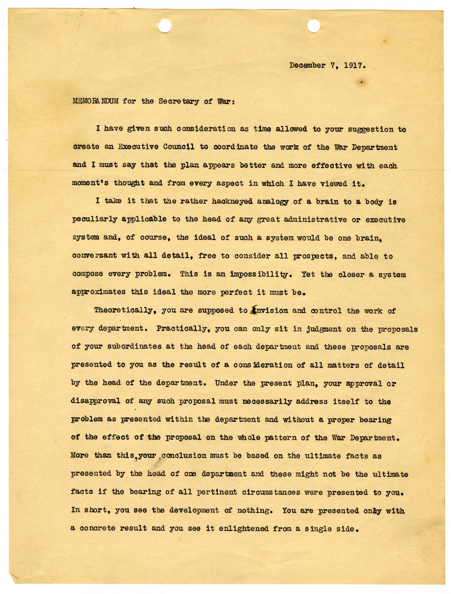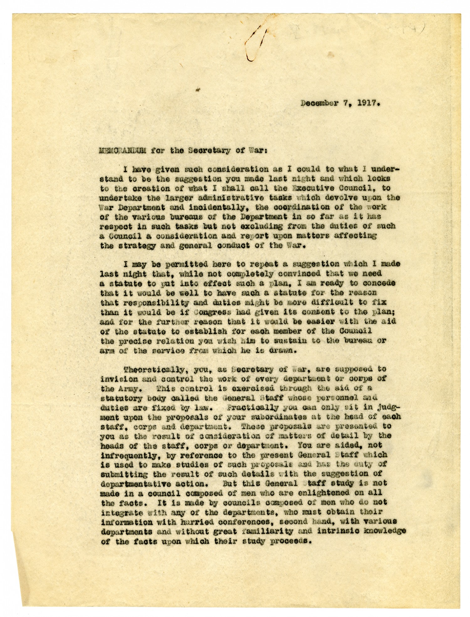 December 7, 1917. Memorandum for the Secretary of War: I have given such consideration as time allowed to your suggestion to create an Executive Council to coordinate the work of the War Department and I must say that the plan appears better and more effective with each moment