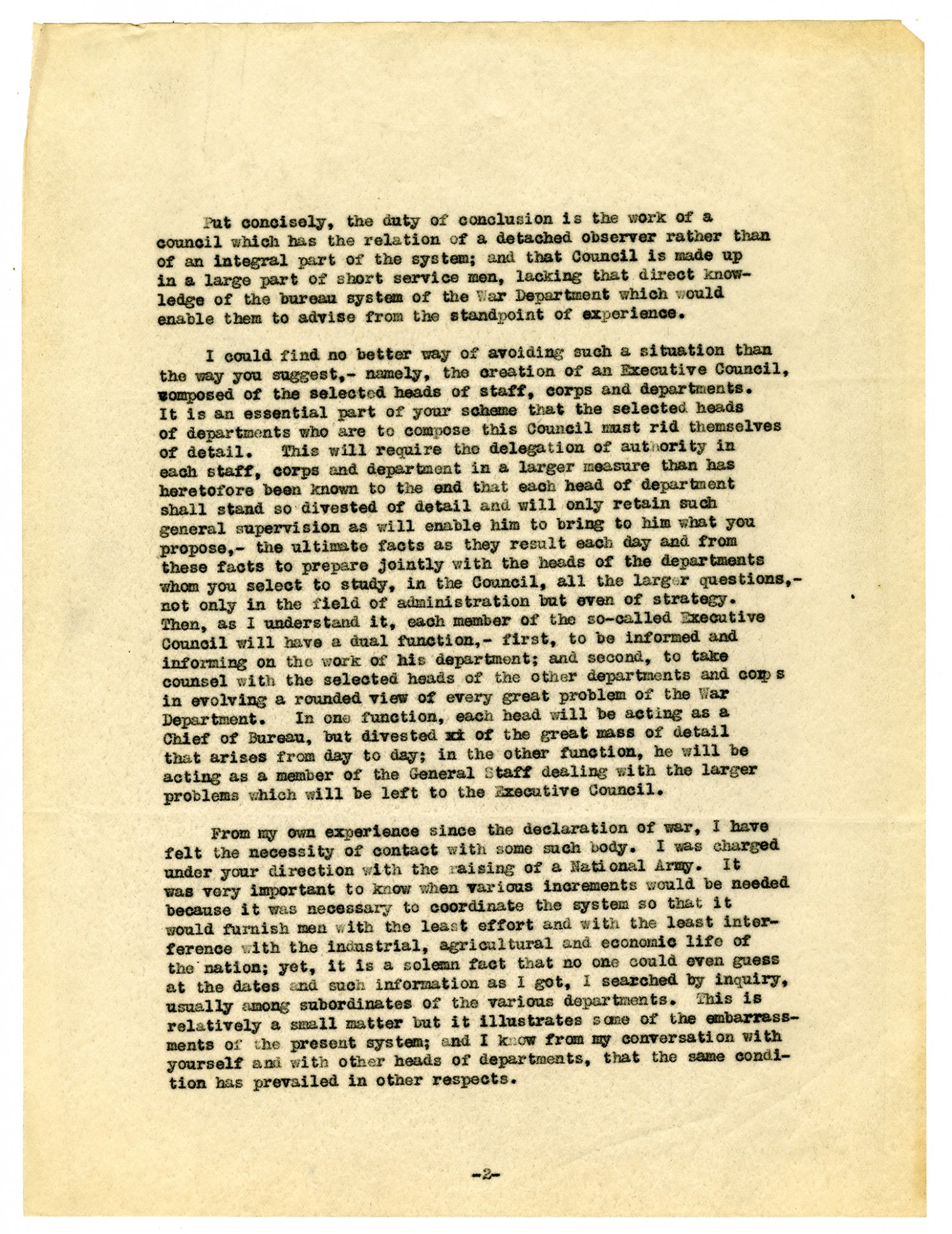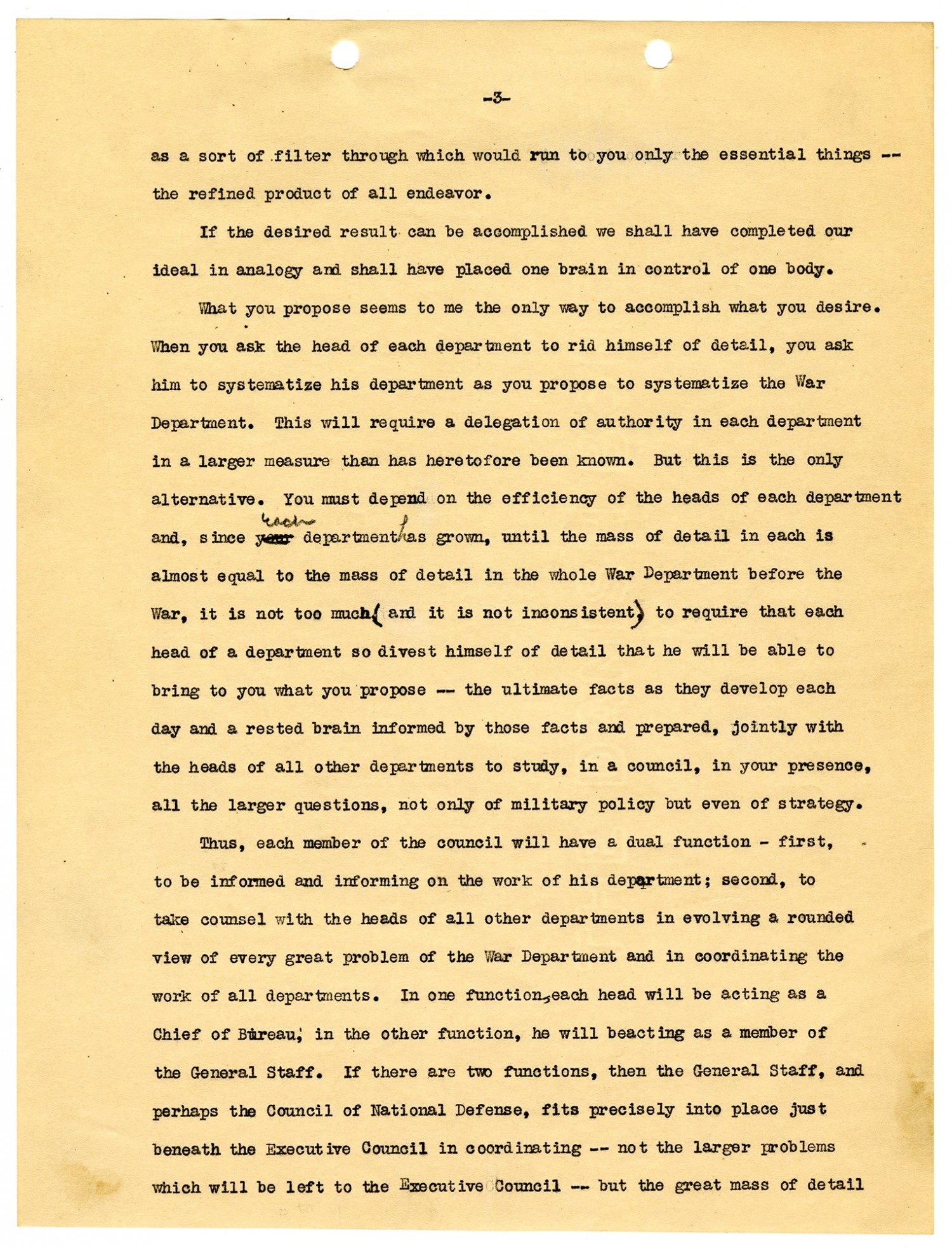 [Page 3] as a sort of filter through which would run to you only the essential things-- the refined product of all endeavor. If the desired result can be accomplished we shall have completed our ideal in analogy and shall have placed one brain in control of one body. What you propose seems to me the only way to accomplish what you desire. When you ask the head of each department to rid himself of detail, you ask him to systematize his department as you propose to systematize the War Department. This will require a delegation of authority in each department in a larger measure than has heretofore been known. But this is the only alternative. You must depend on the efficiency of the heads of each department and, since each department has grown, until the mass of detail in each is almost equal to the mass of detail in the whole War Department before the War, it is not too much (and it is not inconsistent) to require that each head of a department so divest himself of detail that he will be able to bring to you what you propose -- the ultimate facts as they develop each day and a rested brain informed by those facts and prepared, jointly with the heads of all other departments to study, in a council, in your presence, all the larger questions, not only of military policy but even of strategy. Thus, each member of the council will have a dual function - first, to be informed and informing on the work of his department; second, to take counsel with the heads of all other departments in evolving a rounded view of every great problem of the War Department and in coordinating the work of all departments. I one function, each head will be acting as a Chief of Bureau, in the other function, he will beacting as a member of the General Staff. If there are two functions, then the General Staff, and perhaps the Council of National Defense, fits precisely into place just beneath the Executive Council in coordinating -- not the larger problems which will be left to the Executive Council -- but the great mass of detail