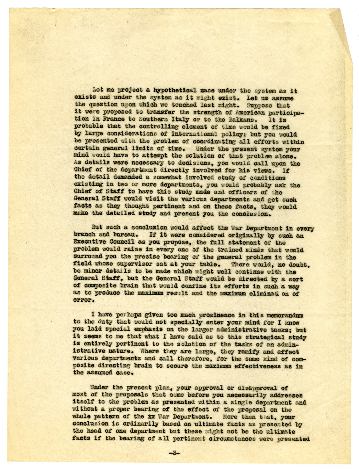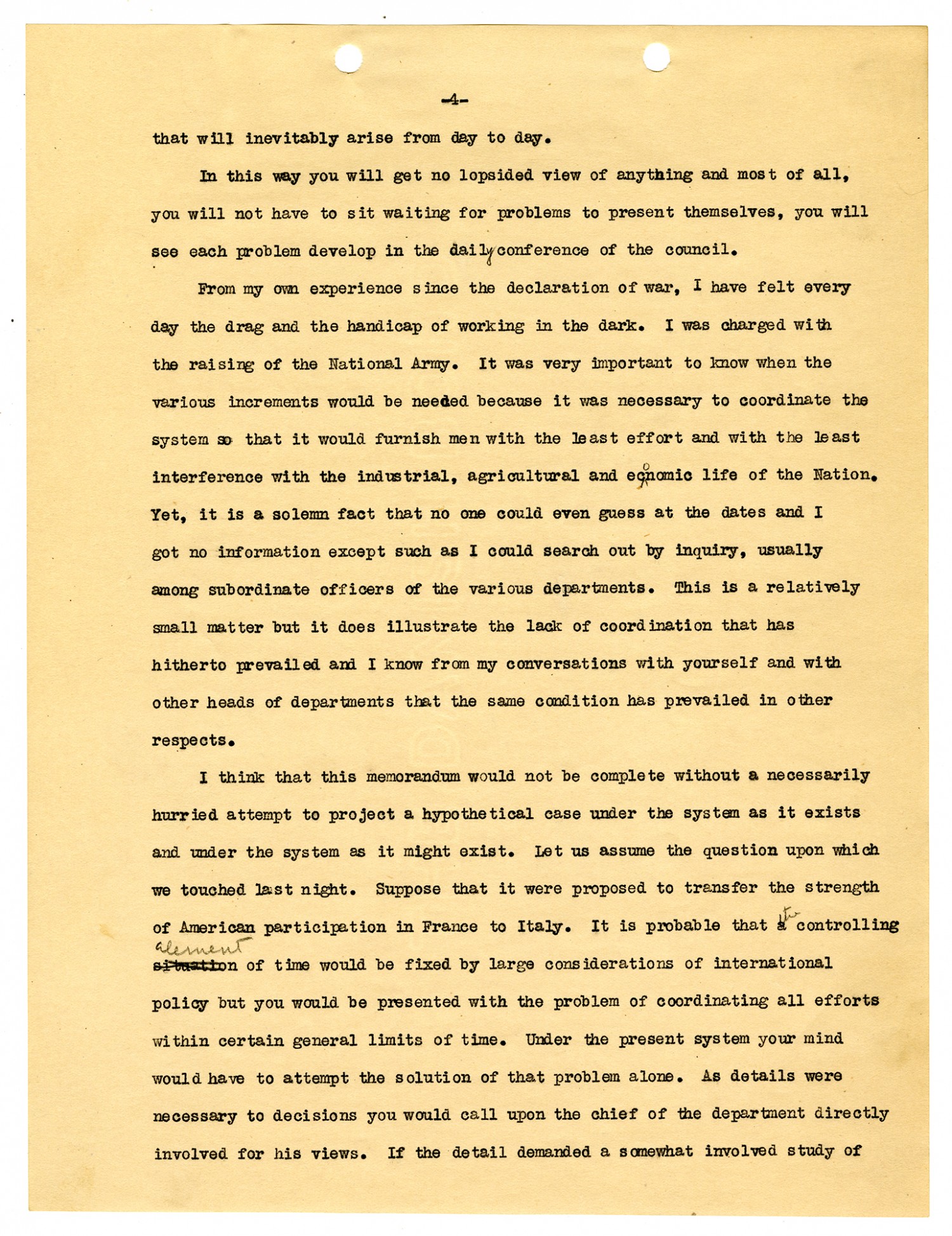 [Page 4] that will inevitably arise from day to day. In this way you will get no lopsided view of anything and most of all, you will not have to sit waiting for problems to present themselves, you will see each problem develop in the daily conference of the council. From my own experience since the declaration of war, I have felt every day the drag and the handicap of working in the dark. I was charged with the raising of the National Army. It was very important to know when the various increments would be needed because it was necessary to coordinate the system so that it would furnish men with the least effort and with the least interference with the industrial, agricultural and economic life of the Nation. Yet, it is a solemn fact that no one could even guess at the dates and I got no information except such as I could search out by inquiry, usually among subordinate officers of the various departments. This is a relatively small matter but it does illustrate the lack of coordination that has hitherto prevailed and I know from my conversations with yourself and with other heads of departments that the same condition has prevailed in other respects. I think that this memorandum would no be complete without a necessarily hurried attempt to project a hypothetical case under the system as it exists and under the system as it might exist. Let us assume the question upon which we touched last night. Suppose that it were proposed to transfer the strength of American participation in France to Italy. It is provably that the controlling element of time would be fixed by large considerations of international policy but you would be presented with the problem of coordinating all efforts within certain general limits of time. Under the present system your mind would have to attempt the solution of that problem alone. As details were necessary to decisions you would call upon the chief of the department directly involved for his views. If the detail demanded a somewhat involved study of