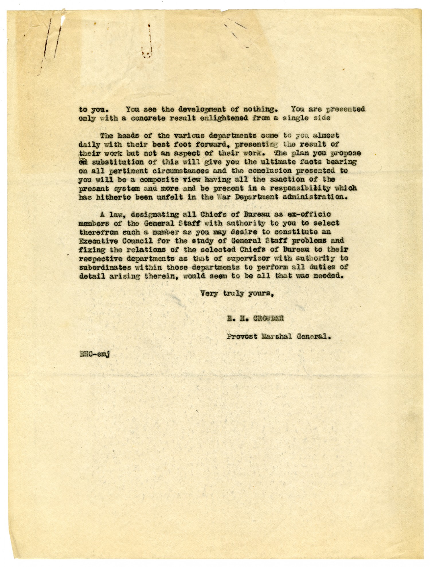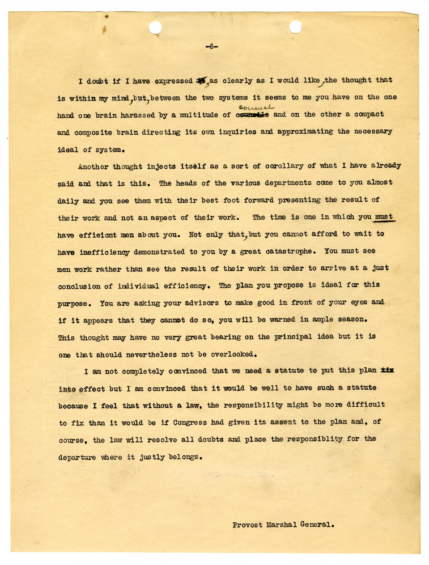 [Page 6] I doubt if I have expressed, as clearly as I would like, the thought that is within my mind, but, between the two systems it seems to me you have on the one hand one brain harassed by a multitude of counsel and on the other a compact and composite brain directing its own inquiries and approximating the necessary ideal of system. Another thought injects itself as a sort of corollary of what I have already said and that is this. The heads of the various departments come to you almost daily and you see them with their best foot forward presenting the result of their work and not an aspect of their work. The time is one in which you must have effieicnt men about you. Not only that, but you cannot afford to wait to have inefficiency demonstrated to you by a great catastrophe. You must see men work rather than see the result of their work in order to arrive at a just conclusion of individual efficiency. The plan you propose is ideal for this purpose. You are asking your advisors to make good in front of your eyes and if it appears that they cannot do so, you will be warned in ample season. This thought may have no very great bearing on the principal idea but it is one that should nevertheless not be overlooked. I am not completely convinced that we nee d a statute to put this plan into effect but I am convinced that it would be well to have such a statute because I feel that without a law, the responsibility might be more difficult to fix than it would be if Congress had given its assent to the plan and, of course, the law will resolve all doubts and place the responsibility for the departure where it justly belongs. Provost Marshal General.