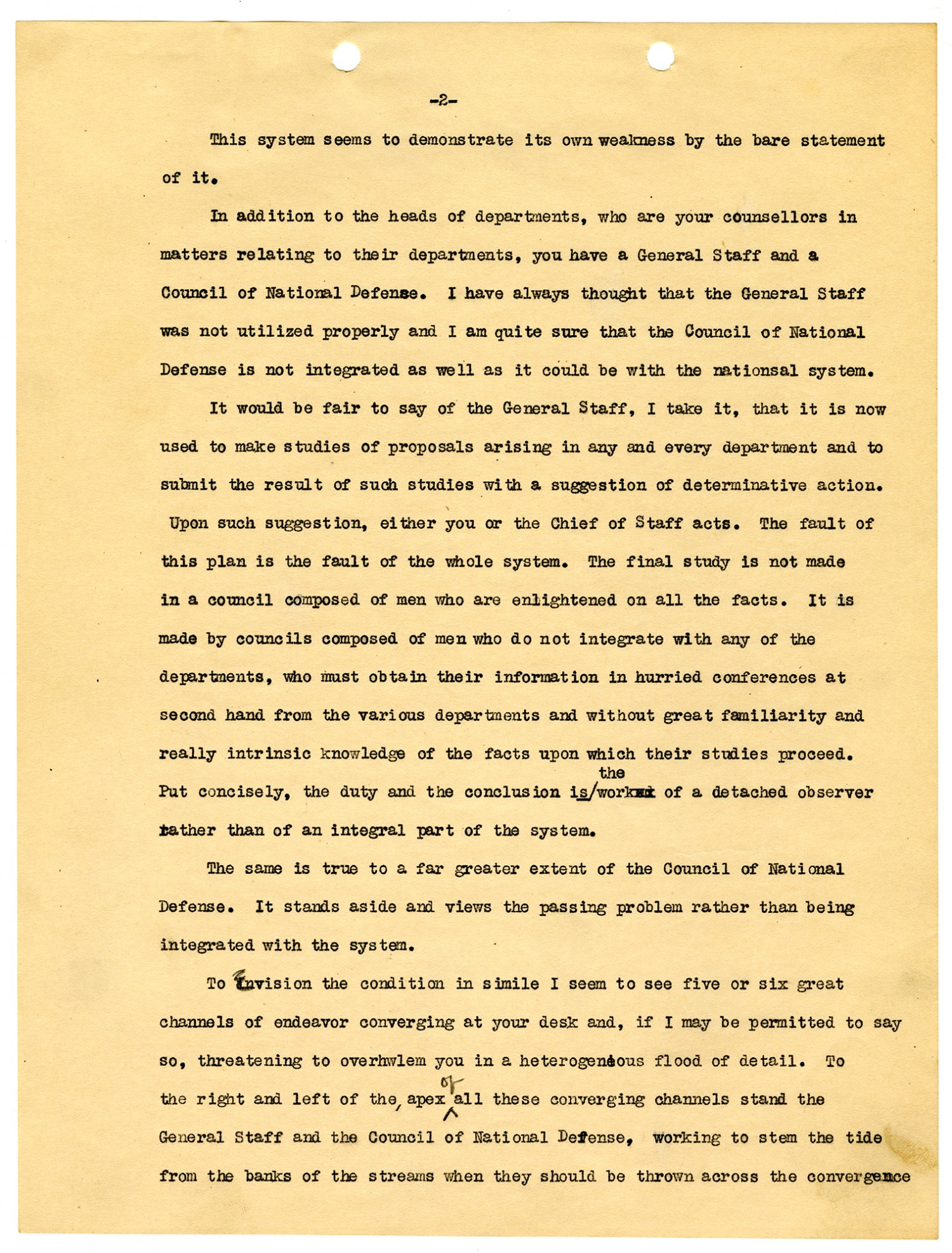 [Page 2] This system seems to demonstrate its own weakness by the bare statement of it. In addition to the heads of departments, who are your counsellors in matters relating to their departments, you have a General Staff and a Council of National Defense. I have always thought that the General Staff was not utilized properly and I am quite sure that the Council of National Defense is not integrated as well as it could be with the nationsal system. It would be fair to say of the General Staff, I take it, that it is now used to make studies of proposals arising in any and every department and to submit the result of such studies with a suggestion of determinative action. Upon such suggestion, either you or the Chief of Staff acts. The fault of this plan is the fault of the whole system. The final study is not made in a council composed of men who are enlightened on all the facts. It is made by councils composed of men who do not integrate with any of the departments, who must obtain their information in hurried conferences at second hand from the various departments and without great familiarity and really intrinsic knowledge of the facts upon which their studies proceed. Put concisely, the duty and the conclusion is the work of a detached observer rather than of an integral part of the system. The same is true to a far greater extent of the Council of National Defense. It stands aside and views the passing problem rather than being integrated with the system. To envision the condition in simile I seem to see five or six great channels of endeavor converging at your desk and, if I may be permitted to say so, threatening to overwlem you in a heterogeneous flood of detail. To the right and left of the apex of all these converging channels stand the General Staff and the Council of National Defense, working to stem the tide from the banks of the streams when they should be thrown across the convergence