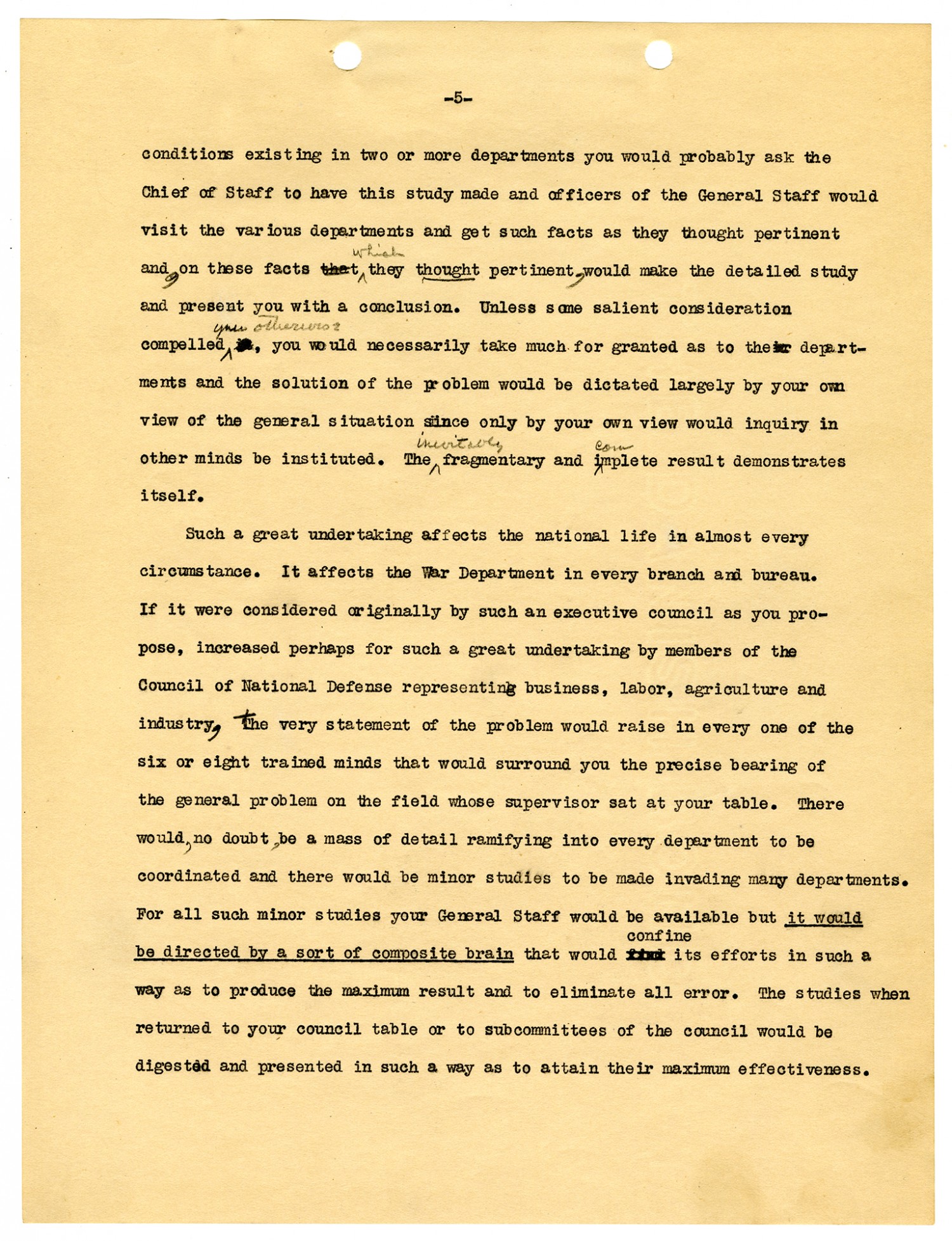 [Page 5] conditions existing in two or more departments you would probably ask the Chief of Staff to have this study made and officers of the General Staff would visit the various departments and get such facts as they thought pertinent and on these facts which they thought pertinent, would make the detailed study and present you with a conclusion. Unless some salient consideration compelled you otherwise, you would necessarily take much for granted as to the departments and the solution of the problem would be dictated largely by your own view of the general situation since only by your own view would inquiry in other minds by instituted. The fragmentary and incomplete result demonstrates itself. Such a great undertaking affects the national life in almost every circumstance. It affects the War Department in every branch and bureau. IF it were considered originally by such an executive council as you propose, increased perhaps for such a great undertaking by members of the Council of National Defense representing business, labor, agriculture and industry, the very statement of the problem would raise in every one of the six or eight trained minds that would surround you the precise bearing of the general problem on the field whose supervisor sat at your table. There would, no doubt, be a mass of detail ramifying into every department to be coordinated and there would be minor studies to be made invading many departments. For all such minor studies your General Staff would be available but it would be directed by a sort of composite brain that would confine its efforts in such a way as to produce the maximum result and to eliminate all error. The studies when returned to you council table or to subcommittees of the council would be digested and presented in such a way as to attain their maximum effectiveness.