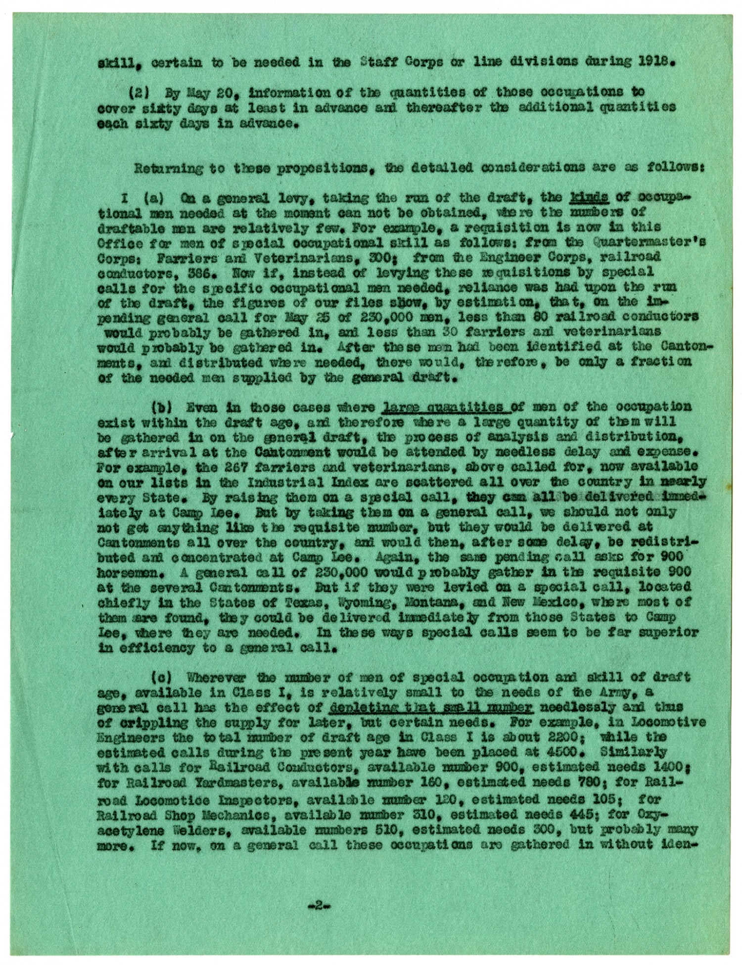 [page 2] skill, certain to be needed in the Staff Corps or line divisions during 1918. (2) By May 20, information of the quantities of those occupations to cover sixty days at least in advance and thereafter the additional quantities each sixty days in advance. Returning to these propositions, the detailed considerations are as follows: I (a) On a general levy, taking the run of the draft, the kinds of occupational men needed at the moment can not be obtained, where the numbers of draftable men are relatively few. For example, a requisition is now in this Office for men of special occupational skill as follows: from the Quartermaster