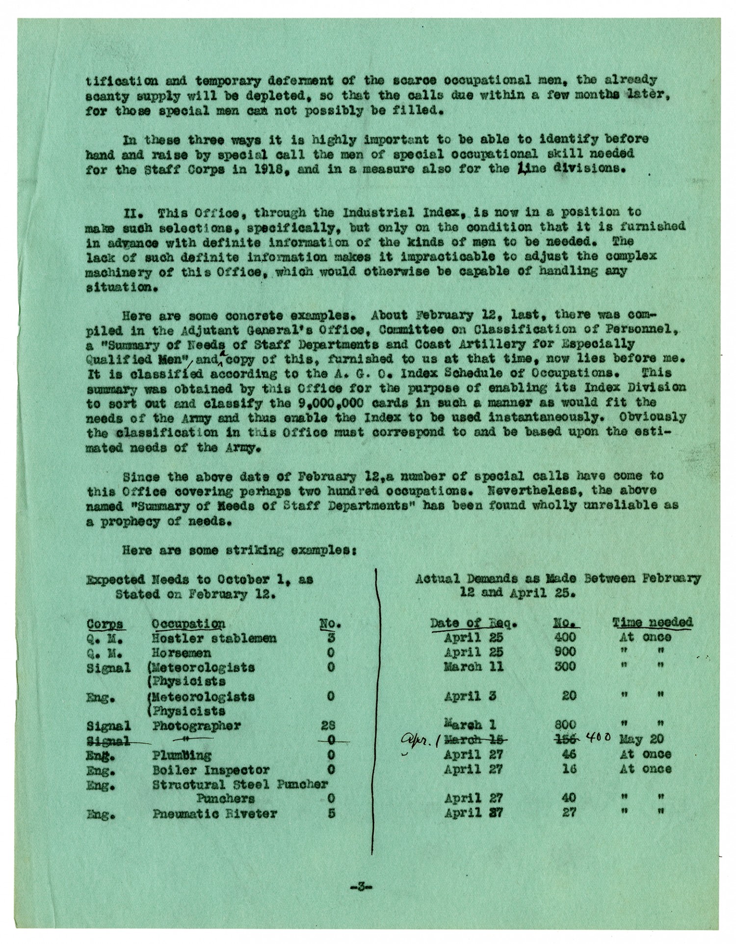 [page 3] tification and temporary deferment of the scarce occupational men, the already scanty supply will be depleted, so that the calls due within a few months later, for those special men can not possibly be filled. In these three ways it is highly important to be able to identify before hand and raise by special call the men of special occupational skill needed for the Staff Corps in 1918, and in a measure also for the line divisions. II. This Office, through the Industrial Index, is now in a position to make such selections specifically, but only on the condition that it is furnished in advance with definite information of the kinds of men to be needed. The lack of such definite information makes it impracticable to adjust the complex machinery of this Office, which would otherwise be capable of handling any situation. Here are some concrete examples. About February 12, last, there was compiled in the Adjutant General