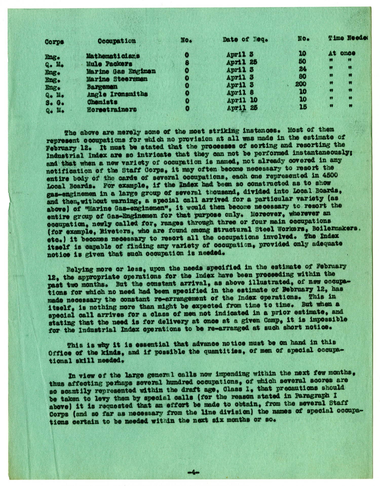 [page 4] [Corps] Eng. [Occupation] Mathematicians [No.] 0 [Date of Req.] April 3 [No.] 10 [Time Needed] At once [Corps] Q.M. [Occupation] Mule Packers [No.] 8 [Date of Req.] April 25 [No.] 50 [Time Needed] At once [Corps] Eng. [Occupation] Marine Gas Engiman [No.] 0 [Date of Req.] April 3 [No.] 24 [Time Needed] At once [Corps] Eng. [Occupation] Marine Steerman [No.] 0 [Date of Req.] April 3 [No.] 80 [Time Needed] At one [Corps] Eng. [Occupation] Bargeman [No.] 0 [Date of Req.] April 3 [No.] 200 [Time Needed] At once [Corps] Q.M [Occupation] Angle Ironsmiths [No.] 0 [Date of Req.] April 8 [No.] 10 [Time Needed] At once [Corps] S.G. [Occupation] Chemists [No.] 0 [Date of Req.] April 10[No.] 10 [Time Needed] At once [Corps] Q.M. [Occupation] Horsetrainers [No.] 0 [Date of Req.] April 25 [No.] 15 [Time Needed] At once The above are merely some of the most striking instances. Most of them represent occupations for which no provision at all was made in the estimate of February 12. It must be stated that the processes of sorting and resorting the Industrial Index are so intricate that they can not be performed instantaneously; and that when a new variety of occupation is named, not already covered in any notification of the Staff Corps, it may often become necessary to resort the entire body of the cards of several occupations, each one represented in 4500 Local Boards. For example, if the Index had been so constructed as to show gas-enginemen in a large group of several thousand, divided into Local Boards, and then, without warning, a special call arrived for a particular variety (as above) of
