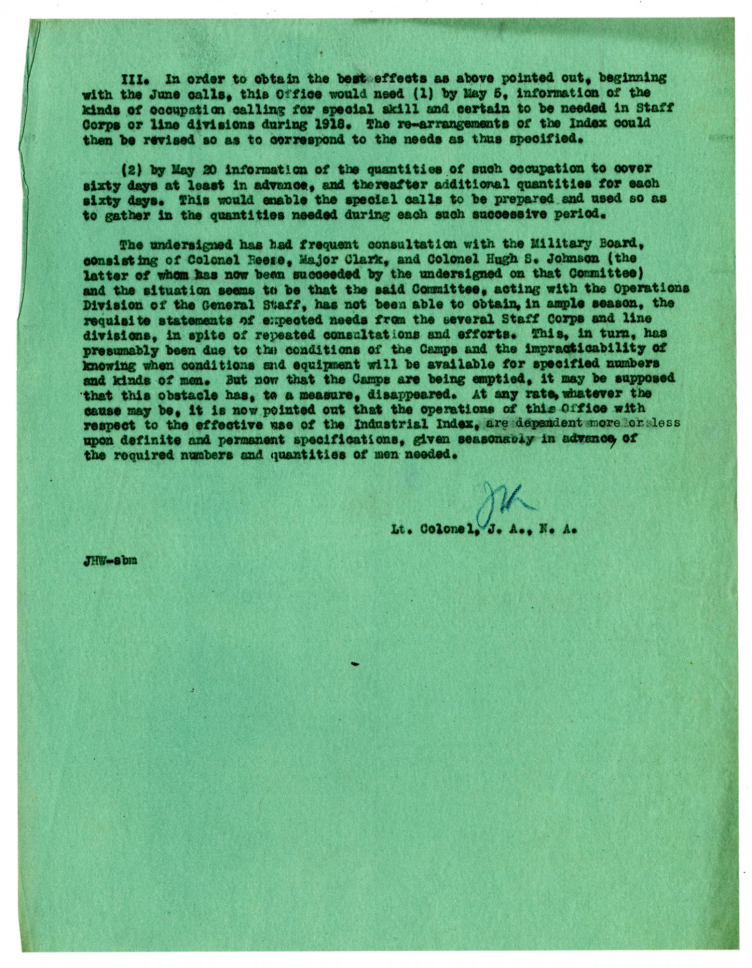 III. In order to obtain the best effects as above pointed out, beginning with the June calls, this Office would need (1) by May 5, information of the kinds of occupation calling for special skill and certain to be needed in Staff Corps or line divisions during 1918. The re-arrangements of the Index could then be revised so as to correspond to the needs as thus specified. (2) by Mary 20 information of the quantities of such occupation to cover sixty days at least in advance, and thereafter additional quantities for each sixty days. This would enable the special calls to be prepared and used so as to gather in the quantities needed during each such successive period. The undersigned has had frequent consultation with the Military Board, consisting of Colonel Reese, Major Clark, and Colonel Hugh S. Johnson (the latter of whom has now been succeeded by the undersigned on that Committee) and the situation seems to be that the said Committee, acting with the Operations Division of the General Staff, has not been able to obtain, in ample season, the requisite statements of expected needs from the several Staff Corps and line divisions, in spite of repeated consultations and efforts. This, in turn, has presumably been due to the conditions of the Camps and the impracticability of knowing when conditions and equipment will be available for specified numbers and kinds of men. But now that the Camps are being emptied, it may be supposed that this obstacle has, to a measure, disappeared. At any rate, whatever the cause may be, it is now pointed out that the operations of this Office with respect to the effective use of the Industrial Index, are dependent more or less upon definite and permanent specifications, given seasonably in advance of the required numbers and quantities of men needed. JW Lt. Colonel, J.A., N.A JHW-sbm