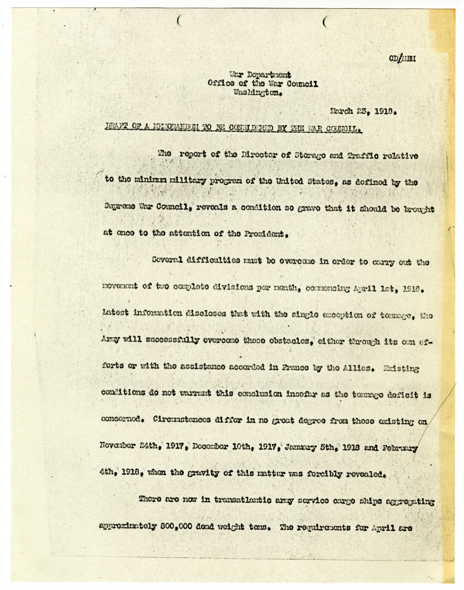 War Department Office of the War Council Washington. March 23, 1918. Draft of a Memorandum to be considered by the War Council. The report of the Director of Storage and Traffic relative to the minimum military program of the United Sates, as defined by the Supreme War Council, reveals a condition so grave that it should be brought an once to the attention of the President. Several difficulties must be overcome in order to carry out the movement of two complete divisions per month, commencing April 1st, 1918. Latest information discloses that with the single exception of tonnage, the Army will successfully overcome these obstacles, either through its own efforts or with the assistance accorded in France by the Allies. Existing conditions do not warrant this conclusion insofar as the tonnage deficit is concerned. Circumstances differ in no great degree from those existing on November 24th, 1917, December 10th, 1917, January 5th, 1918 and February 4th, 1918, when the gravity of this matter was forcibly revealed. There are now in transatlantic army service cargo ships aggregating approximately 800,000 dead weight tons. The requirements for April are