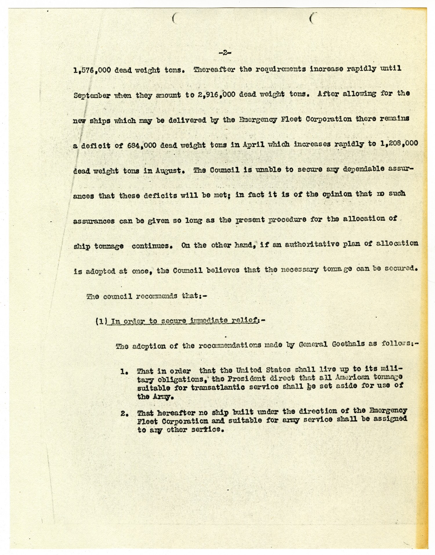 [page 2] 1,576,000 dead weight tons. Thereafter the requirements increase rapidly until September when they among to 2,916,000 dead weight tons. After allowing for the new ships which may be delivered by the Emergency Fleet Corporation there remains a deficit of 684,000 dead weight tons in April which increases rapidly to 1,208,000 dead weight tons in August. The Council is unable to secure any dependable assurances that these deficits will be met; in fact it is of the opinion that no such assurances can be given so long as the present procedure for the allocation of ship tonnage continues. On the other hand, if an authoritative plan of allocation is adopted at once, the Council believes that the necessary tonnage can be secured. The council recommends that:- (1) In order to secure immediate relief:- The adoption of the recommendations made by General Goethals as follows:- 1. That in order that the United States shall live up to its military obligations, the President direct that all American tonnage suitable for transatlantic service shall be set aside for use of the Army. 2. That hereafter no ship built under the direction of the Emergency Fleet Corporation and suitable for army service shall be assigned to any other service.