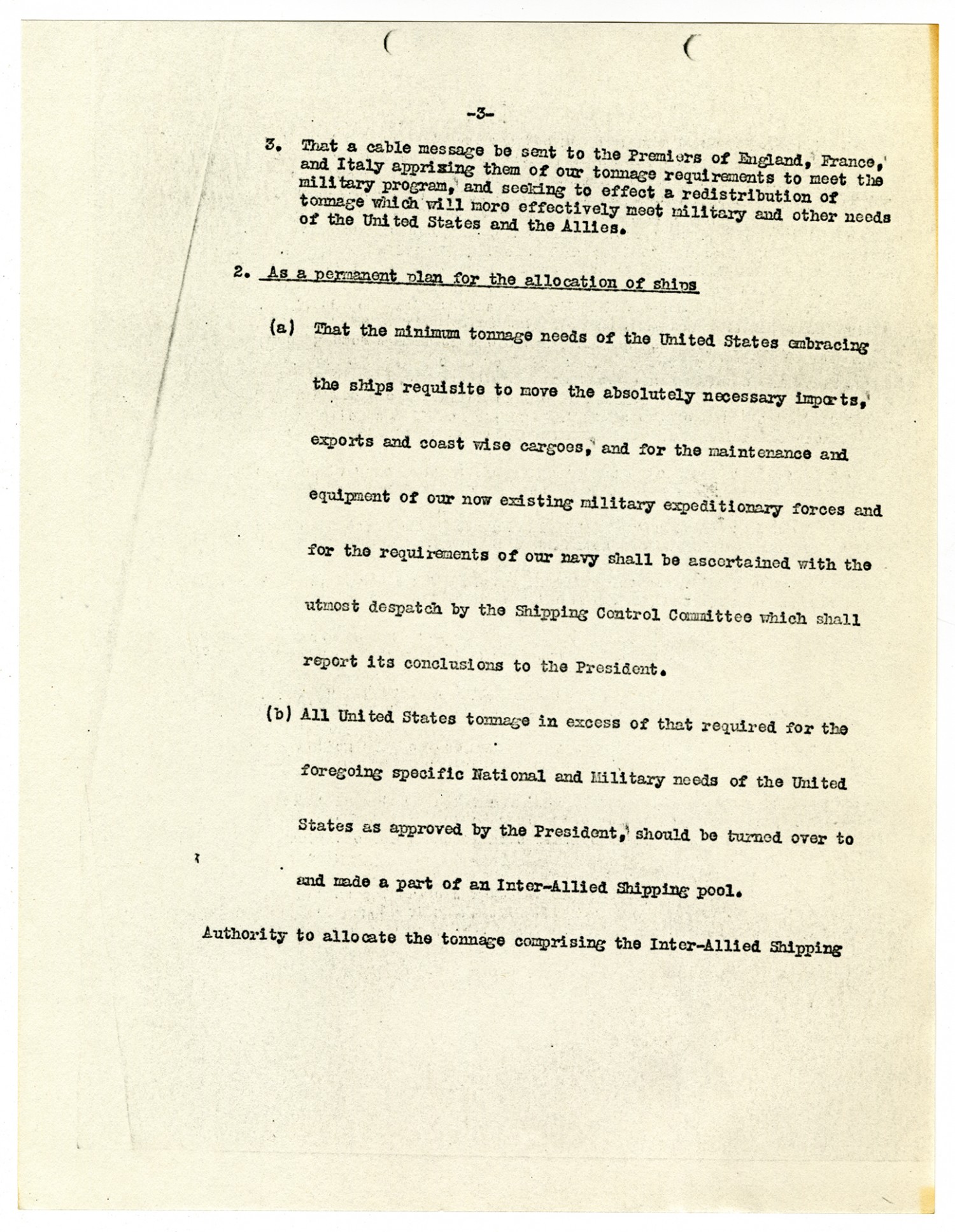 [page 3] 3. That a cable message be sent to the Premiers of England, France, and Italy apprising them of our tonnage requirements to meet the military program, and seeking to effect a redistribution of tonnage which will more effectively meet military and other needs of the United States and the Allies. 2. As a permanent plan for the allocation of ships. (a) That the minimum tonnage needs of the United States embracing the ships requisite to move the absolutely necessary imports, exports and coast wise cargoes, and for the maintenance and equipment of our now existing military expeditionary forces and for the requirements of our navy shall be ascertained with the utmost despatch by the Shipping Control Committee which shall report its conclusions to the President. (b) All United States tonnage in excess of that required for the foregoing specific National and Military needs of the United States as approved by the President, should be turned over to and made a part of an Inter-Allied Shipping pool. Authority to allocate the tonnage comprising the Inter-Allied Shipping