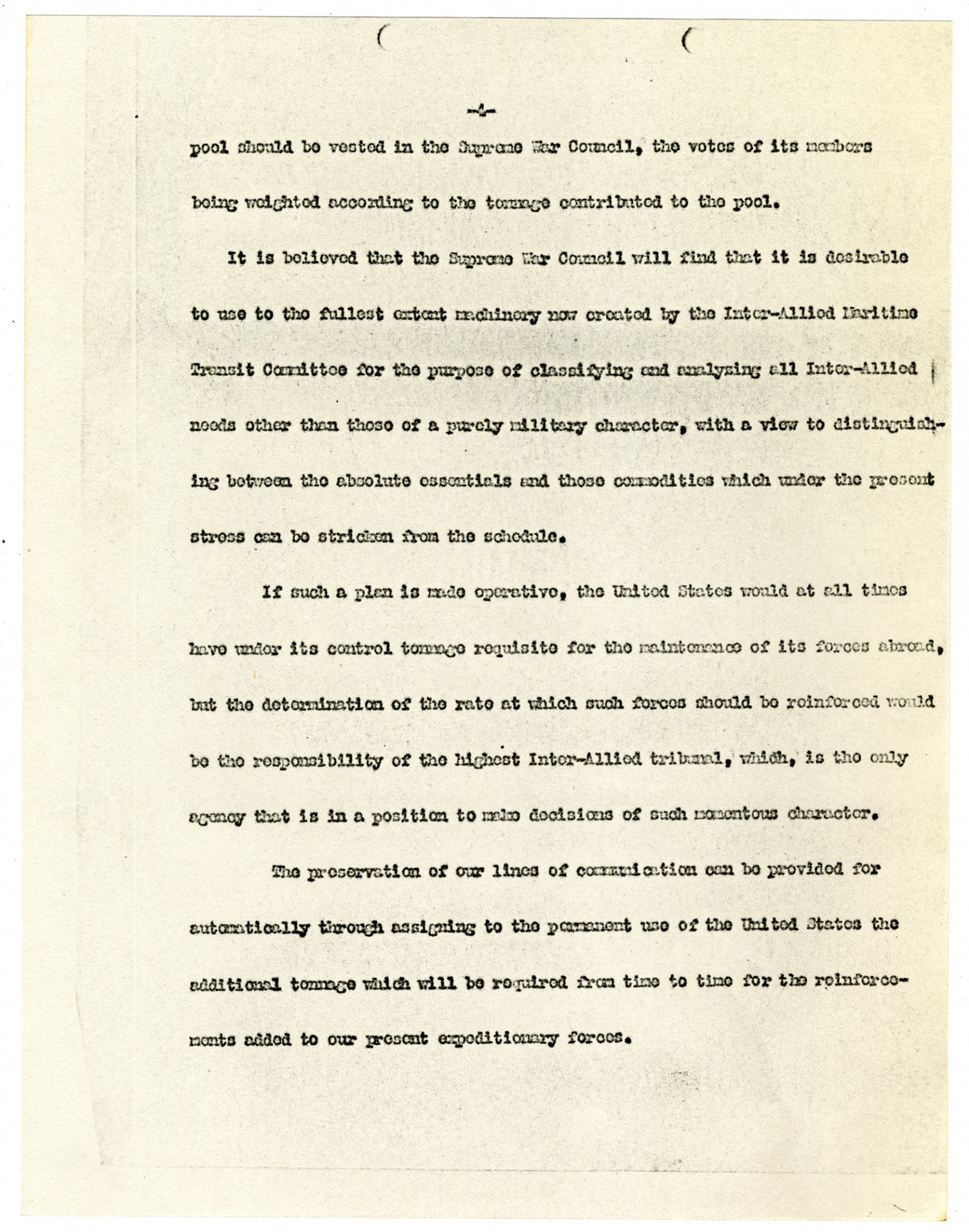 [page 4] pool should be vested in the Supreme War Council, the votes of its members being weighted according to the tonnage contributed to the pool. It is believed that the Supreme War Council will find that it is desirable to use to the fullest extent machinery now created by the Inter-Allied Maritime Transit Committee for the purpose of classifying and analyzing all Inter-Allied needs other than those of a purely military character, with a view to distinguishing between the absolute essentials and those commodities which under the present stress can be stricken from the schedule. If such a plan is made operative, the United States would at all times have under its control tonnage requisite for the maintenance of its forces abroad, but the determination of the rate at which such forces should be reinforced would be the responsibility of the highest Inter-Allied tribunal, which, is the only agency that is in a position to make decisions of such momentous character. The preservation of our lines of communication can be provided for automatically through assigning to the permanent use of the United States the additional tonnage which will be required from time to time for the reinforcements added to our present expeditionary forces.