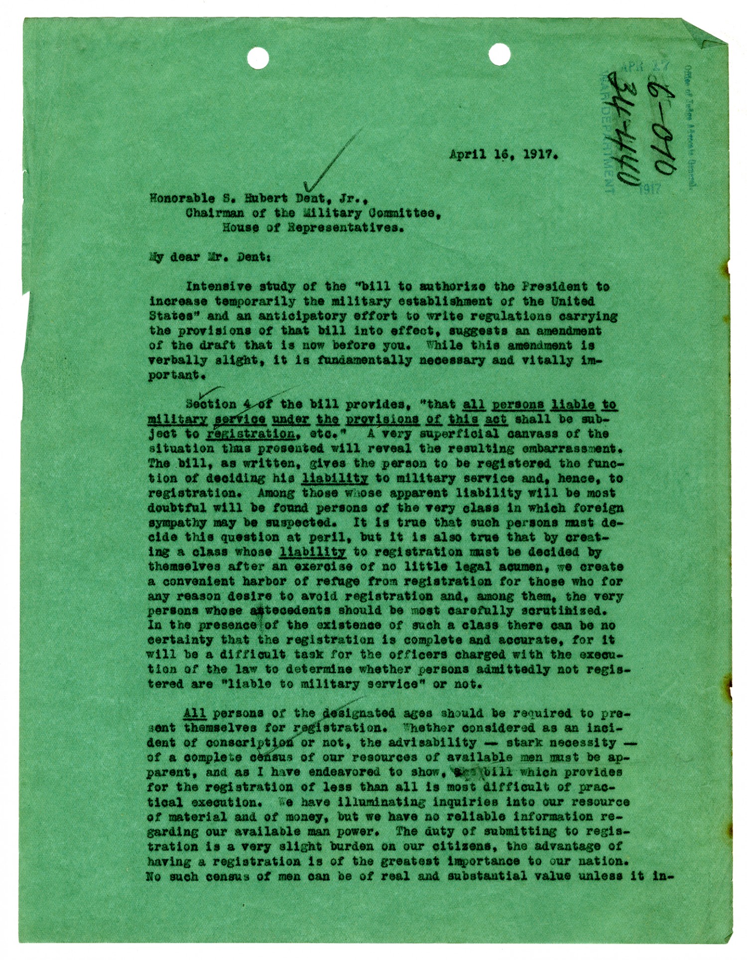 April 16, 1917. Honorable S. Hubert Dent, Jr., Chairman of the Military Committee, House of Representatives. My dear Mr. Dent: Intensive study of the