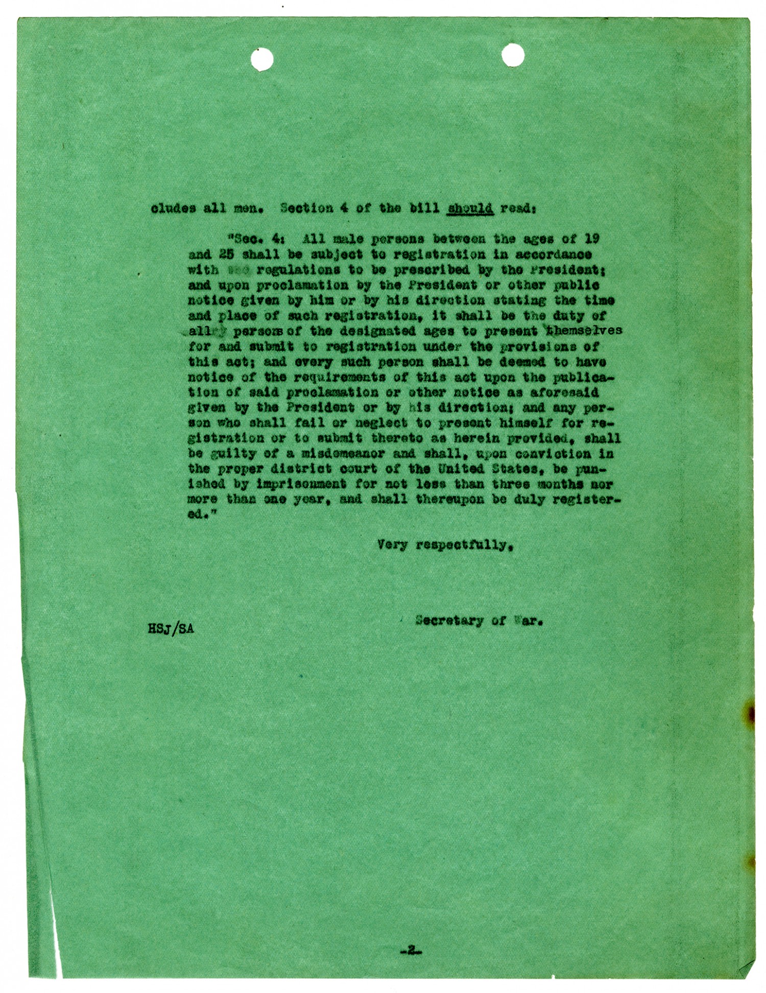 | Description | Letter to the Honorable S. Hubert Dent Jr. from the Secretary of War concerning section 4 of the bill that allowed the President to increase temporarily the military establishment of the United States. Section 4 of this bill addressed the recruitment of men to serve in the military. The Secretary of War suggested that all young men between the ages of 19 and 25 be liable for registration. This provided a better estimate of how many soldiers the United States could raise. This letter is part of a collection compiled by Enoch Herbert Crowder, the Edinburg, Grundy County, Missouri native who served as Judge Advocate General. Crowder devised the Selective Service Act in 1917 which drafted America's forces during World War I. |