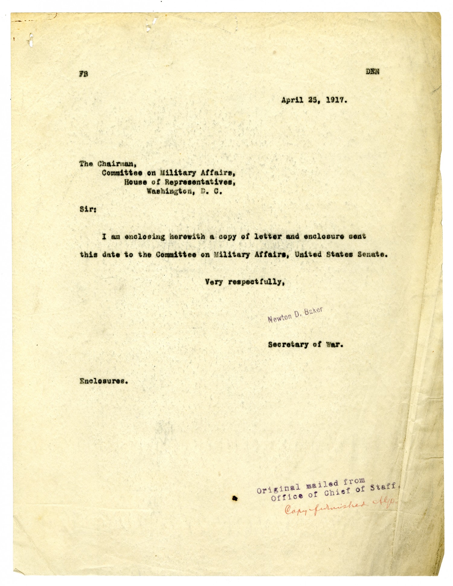 FB DEN April 25, 1917. The Chairman, Committee on Military Affairs, House of Representatives, Washington, D.C. Sir: I am enclosing herewith a copy of letter and enclosure sent this date to the Committee on Military Affairs, United States Senate. Very respectfully, [Stamped] Newton D. Baker Secretary of War. Enclosures. Original mailed from Office of Chief of Staff Copy furnished Alp.