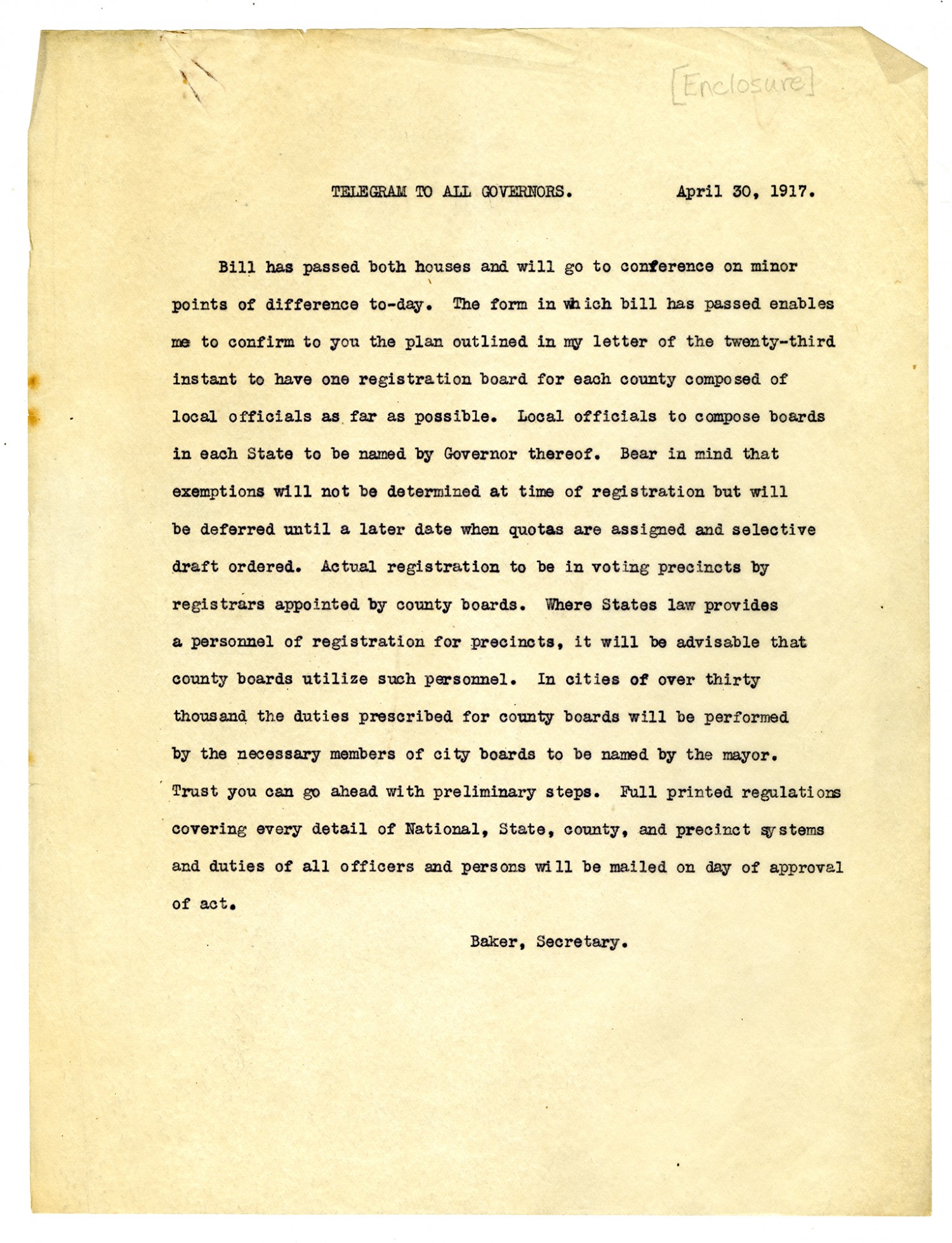 [Enclosure] TELEGRAM TO ALL GOVERNORS. April 30, 1917. Bill has passed both houses and will go to conference on minor points of difference to-day. The form in which bill has passed enables me to confirm to you the plan outlined in my letter of the twenty-third instant to have one registration board for each county composed of local officials as far as possible. Local officials to compose boards in each State to be named by Governor thereof. Bear in mind that exemptions will not be determined at time of registration but will be deferred until a later date when quotas are assigned and selective draft ordered. Actual registration to be in voting precincts by registrars appointed by county boards. Where States law provides a personnel of registration for precincts, it will be advisable that county boards utilize such personnel. In cities of over thirty thousand the duties prescribed for county boards will be performed by the necessary members of city boards to be named by the mayor. Trust you can go ahead with preliminary steps. Full printed regulations covering every detail of National, State, county, and precinct systems and duties of all officers and persons will be mailed on day of approval of act. Baker, Secretary.